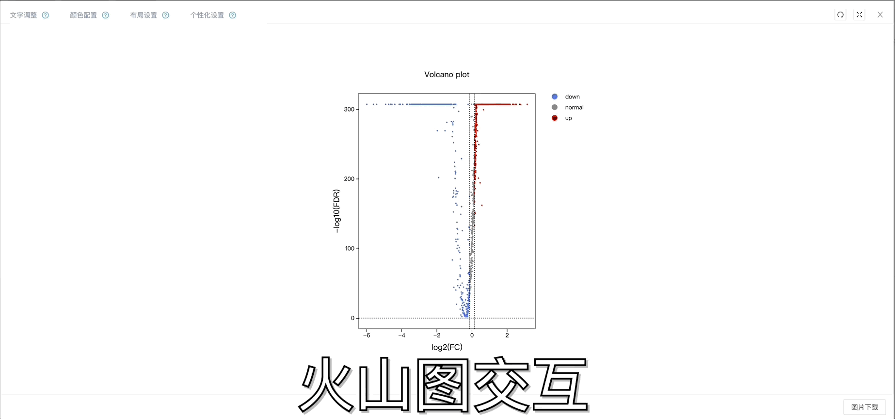 火山圖(Volcano Plot)可以快速地查看基因/物質(zhì)在兩個(組)樣品中表達(dá)水平的差異?;鹕綀D的交互式支持自定義展示一定數(shù)目的重點(diǎn)差異基因,還支持支持選擇重點(diǎn)差異基因進(jìn)行數(shù)據(jù)篩選,進(jìn)行二次數(shù)據(jù)處理。