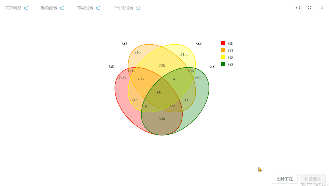 通常會對差異的基因/物質(zhì)做簡單的韋恩圖繪制,也可以對總體的基因/物質(zhì)進(jìn)行繪圖。交互韋恩圖的功能非常靈活,2-5個分組自動繪制韋恩圖,5-32個自動為花瓣圖,支持經(jīng)典韋恩圖、齒輪圖的更換,還支持?jǐn)?shù)字點(diǎn)擊進(jìn)行下級數(shù)據(jù)的二次篩選交互。