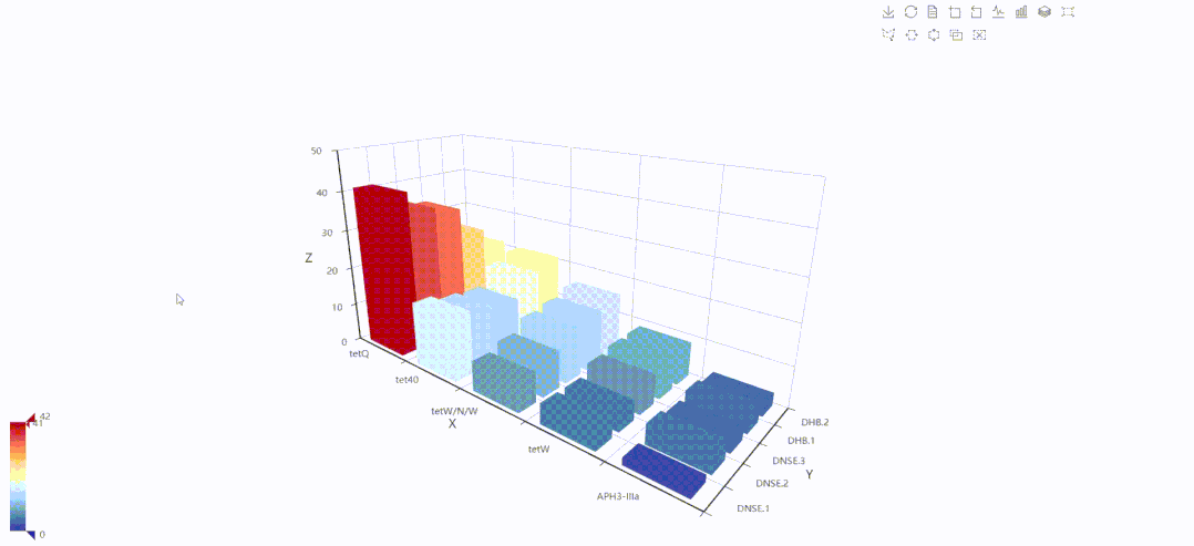 一次繪圖,多圖自由轉(zhuǎn)換。排列柱狀圖、堆疊柱狀圖、排列點(diǎn)線圖、堆疊點(diǎn)線圖、3D柱狀圖等互相自由切換。同時,只需點(diǎn)擊下legend圖例,即可取消掉過多的展示項(xiàng),從而達(dá)到重新繪制的目的。滾動下鼠標(biāo),即可隱藏過多的樣品展示。