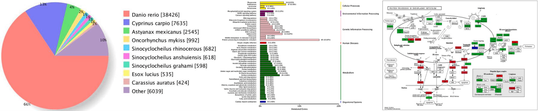 用RNA-seq技術研究氨脅迫下鯉魚肝胰腺的基因表達譜,共有3367個單基因被鑒定為與氨脅迫相關的差異表達基因(DEG)。1724DEG下調,1643DEG上調。KEGG分析將這些DEG的代謝