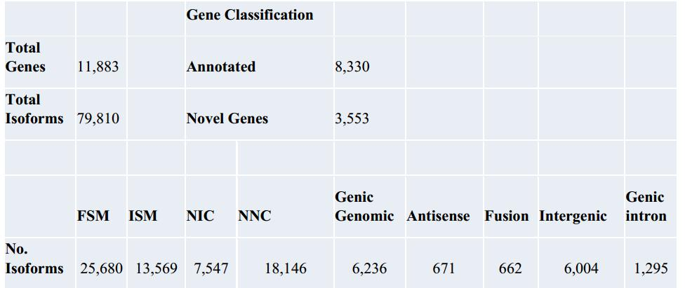 作者獲得了3100萬(wàn)次reads,其中使用Canu對(duì)2200萬(wàn)reads(71%)進(jìn)行了錯(cuò)誤糾正,只關(guān)注全長(zhǎng)reads,通過(guò)確定為具有5’引物和poly(A)和3’引物的序列全長(zhǎng)序列。ToFU轉(zhuǎn)錄組結(jié)果包含總共11,883個(gè)基因和79,810個(gè)亞型(表北京百邁客生物科技有限公司1),其中8330個(gè)基因與NCBI注釋基因匹配,而3553個(gè)基因是新的。所有這些都對(duì)應(yīng)于橄欖蠅轉(zhuǎn)錄組在同種型水平上比當(dāng)前NCBI注釋的四倍擴(kuò)增。針對(duì)UniprotSwiss-prot數(shù)據(jù)庫(kù)的預(yù)測(cè)蛋白質(zhì)序列的搜索顯示高比對(duì)的是雙翅目,其次是哺乳類動(dòng)物(圖1B)。盡管鑒定了3553個(gè)新基因,但預(yù)計(jì)只有269個(gè)含有開(kāi)放閱讀框。與注釋基因相比,超過(guò)50%的新基因是單外顯子,其中超過(guò)80%的基因是多外顯子并且還包含更高百分比的單同種型基因。且新基因的表達(dá)量要低于已注釋基因。在結(jié)構(gòu)上,SQANTI根據(jù)其剪接點(diǎn)和基因組坐標(biāo)將轉(zhuǎn)錄本分為9類,分別為FSM,ISM,NIC,NNC,基因組基因,反義,融合,基因間區(qū)和基因內(nèi)含子(圖1E)。