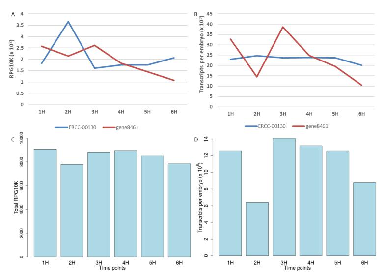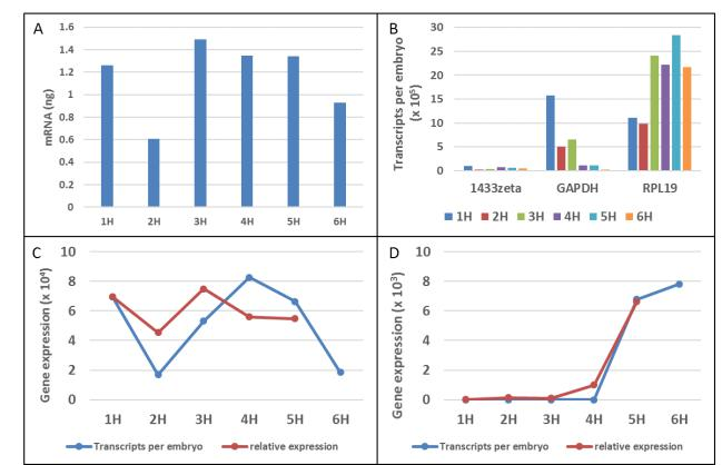 通過(guò)將每個(gè)胚胎的每個(gè)基因的所有轉(zhuǎn)錄物相加并計(jì)算以毫微克計(jì)的當(dāng)量來(lái)計(jì)算每個(gè)胚胎的總mRNA(圖3A),總mRNA在1hpo時(shí)從1.2ng/胚胎下降至2hpo時(shí)為0.61ng/胚胎,然后在3hpo時(shí)增加至1.49ng/胚胎,然后在6hpo采樣結(jié)束時(shí)降至0.93ng/胚胎,反映了每個(gè)胚胎的總轉(zhuǎn)錄本(圖2D)。假設(shè)2-5%的總RNA是多腺苷酸化的,mRNA水平與我們?cè)诿總€(gè)胚胎中獲得的總RNA產(chǎn)量一致。