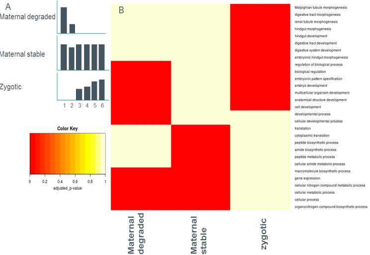 我們對(duì)3個(gè)類別基因集進(jìn)行富集分析;母體降解基因,受精卵基因和母體穩(wěn)定/上調(diào)基因。母體降解基因也是1hpo中表達(dá)高的基因,富含細(xì)胞過(guò)程,發(fā)育和新陳代謝(圖6)。母體降解的基因也富含轉(zhuǎn)錄因子,例如DREF,BEAF-32A,PNR,它們是相應(yīng)的果蠅同源基因。類似母體降解基因,母體穩(wěn)定/上調(diào)基因在翻譯,生物合成過(guò)程,基因表達(dá),代謝過(guò)程等方面得到豐富,反映了快速生長(zhǎng)胚胎的高代謝活性,DREF轉(zhuǎn)錄因子也在這些基因中富集。受精卵基因富含特定的組織形成和發(fā)展過(guò)程,包括:后腸發(fā)育,模式規(guī)范,消化道形態(tài)發(fā)生等功能。