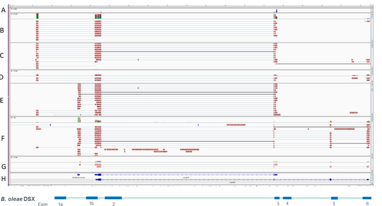 雙翅目昆蟲(chóng)的性別決定機(jī)制在很大程度上是相同的,在果蠅(Drosophilamelanogaster)中,性別決定機(jī)制已被廣泛研究,性致死基因(sxl)作為主要調(diào)節(jié)因子,根據(jù)性染色體與常染色體的比例,調(diào)節(jié)本身和變異基因(tra)的性別特異性選擇性剪接。tra反過(guò)來(lái)調(diào)節(jié)性別特異性雙重性別的選擇性剪接(dsx),這是級(jí)聯(lián)的最后一個(gè)成員和性別差異發(fā)育的中介。B.oleae同源物已經(jīng)鑒定了sx1,tra和dsx。然而,主要的調(diào)控方式仍然難以捉摸。已經(jīng)提出橄欖蠅的性別決定在胚胎發(fā)育的前6小時(shí)內(nèi)發(fā)生,并且通過(guò)類似于黑腹果蠅中的性別決定機(jī)制的tra和dsx的可變剪接來(lái)調(diào)控。在轉(zhuǎn)錄組數(shù)據(jù)中,我們能夠觀察到tra和dsx的各種可變剪接。使用來(lái)自成年雄性和雌性頭部的數(shù)據(jù)來(lái)識(shí)別性別特異性亞型。在dsx的情況下,與成齡相比,早期發(fā)育階段的亞型復(fù)雜性顯著不同。在數(shù)據(jù)中,看到具有不同轉(zhuǎn)錄起始位點(diǎn)和長(zhǎng)度較長(zhǎng)的亞型,因?yàn)樵诎l(fā)育的早期胚胎階段存在突出的亞型(圖8),成齡頭部組織中的這些亞型轉(zhuǎn)移到較短的亞型中,外顯子4存在于雌性中但不存在于雄性中。由于我們無(wú)法在早期胚胎階段檢測(cè)到這些性別特異性亞型,我們認(rèn)為它們的表達(dá)在發(fā)育過(guò)程后期開(kāi)始。然而,它們?cè)诤笃陔A段的積累代表了在發(fā)育早期階段激活的性別調(diào)控系統(tǒng)。北京百邁客生物科技有限公司。