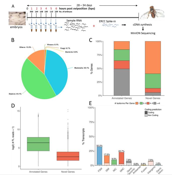 由于受精卵的興趣和令人費(fèi)解的性質(zhì),胚胎發(fā)育已在模型生物中廣泛研究。然而,在生物中沒(méi)有很好表征,長(zhǎng)讀長(zhǎng)RNA-seq有可能揭示迄今未知的基因,完善注釋信息,并擴(kuò)展亞型多樣性。作者匯集了混合性別橄欖果蠅(Bactroceraoleae)胚胎,這些胚胎在產(chǎn)卵的前6個(gè)小時(shí)后每小時(shí)收集一次。這些時(shí)期的研究很有意義,因?yàn)橹皩?duì)B.oleae的研究表明,在此期間開(kāi)始通過(guò)基因的可變剪接介導(dǎo)的性別決定機(jī)制。此外,來(lái)自地中海實(shí)蠅(Ceratitiscapitata)的證據(jù)表明,在此期間發(fā)生極細(xì)胞(原始生殖細(xì)胞)的建立,因此,在此期間闡明轉(zhuǎn)錄狀態(tài)非常重要。