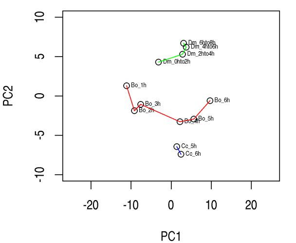 進(jìn)一步尋求確定觀察到的表達(dá)模式是否可以在不同的生物樣品組中重復(fù)并使用實(shí)時(shí)定量PCR(qPCR),這是當(dāng)前用于量化基因表達(dá)的標(biāo)準(zhǔn)方法。然而,qPCR基因表達(dá)的相對(duì)方法需要鑒定內(nèi)參基因其表達(dá)在樣品間保持穩(wěn)定。使用作者的數(shù)據(jù)來(lái)確定這些常見(jiàn)內(nèi)參基因以及GAPDH的表達(dá)水平的變化,評(píng)估了3個(gè)基因的qPCR表達(dá);SRY,HID和LINGERER,用RPL19和14-3-3zeta作為內(nèi)參基因,在不同的生物重復(fù)樣品組中(跳過(guò)6小時(shí)時(shí)間點(diǎn))。我們觀察到類似的基因表達(dá)趨勢(shì)(特別是14-3-3zeta與RPL19相比)。為了進(jìn)一步探索表達(dá)譜,我使用差異表達(dá)的明顯的基因進(jìn)行主成分分析(PCA)和層次聚類分析,第一個(gè)主成分將前3個(gè)時(shí)間點(diǎn)與最后3個(gè)時(shí)間點(diǎn)分開(kāi),分層聚類進(jìn)一步表明前3個(gè)和后3個(gè)時(shí)間點(diǎn)是分別共同聚類的。