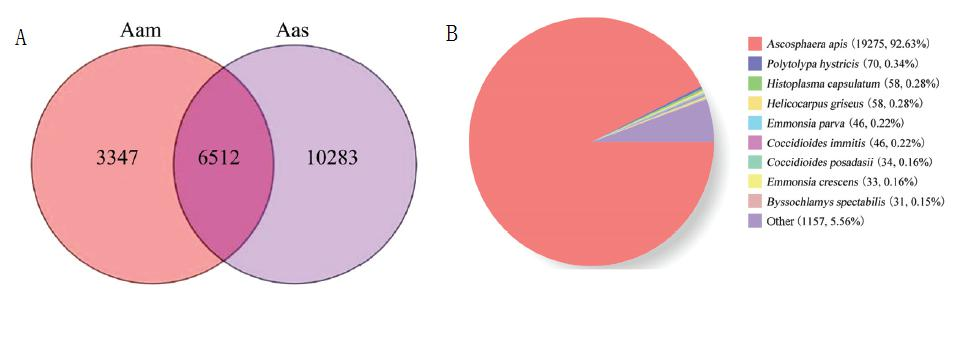 圖2球囊菌菌絲和孢子全長轉錄本的Venn分析(A)、全長轉錄本的Nr數(shù)據庫注釋(B)Fig.2Vennanalysisoffull-lengthtranscriptsinA.apismyceliumandspore(A)、Nrdatabaseannotationoffull-lengthtranscripts(B)