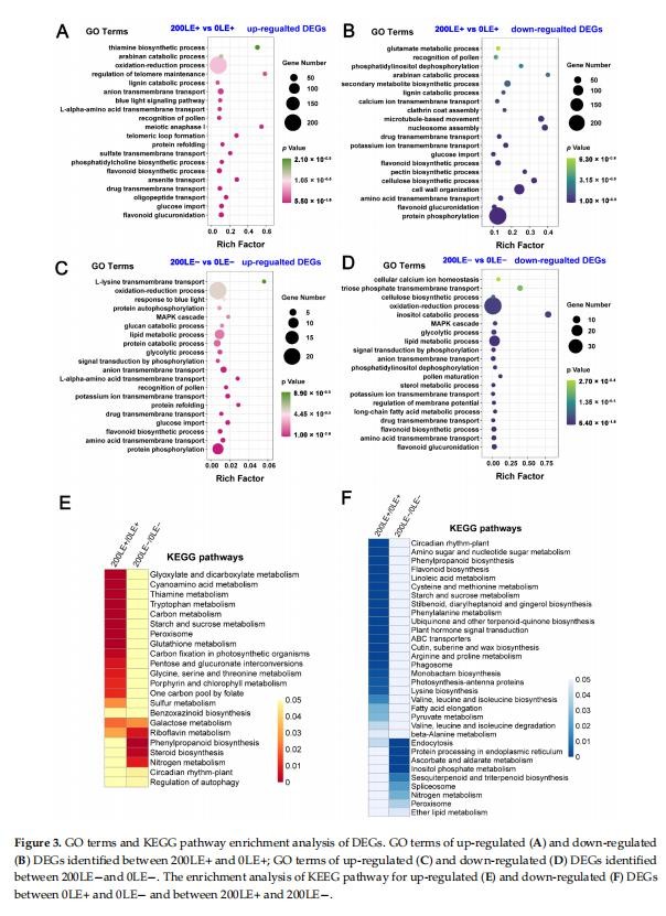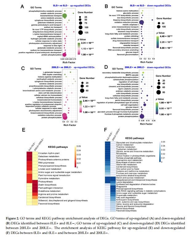 E.gansuensis上調(diào)1269個基因,下調(diào)1195個0LE+基因(葉E+植物在0mMNaCl下)與0LE-(E-植物在0mMNaCl下的葉子)相比。類似地,E.gansuensis誘導(dǎo)844個基因并抑制200LE+(E+植物的葉子)的973個基因在200mMNaCl下)與200LE-(E-植物的葉子在200mMNaCl下)相比(圖1)。目前的結(jié)果表明在NaCl脅迫下E.gansuensis對基因的調(diào)控有巨大的影響與200mMNaCl相比。對0LE+和0LE-之間的DEGs進行GO富集分析發(fā)現(xiàn),E.gansuensis主要誘導(dǎo)“鈉離子跨膜轉(zhuǎn)運”、“胚胎后發(fā)育的正調(diào)控”、“蛋白質(zhì)磷酸化”、“光系統(tǒng)化學計量調(diào)整”和“谷氨酸代謝過程”(圖2A)。此外,GO富集分析表明,類別“類黃酮葡萄糖醛酸化”、“類黃酮生物合成過程”、“氧化-還原”過程”和“陰離子跨膜轉(zhuǎn)運”在下調(diào)中富集E.gansuensis在0mMNaCl濃度下的DEGs(圖2B)。這些結(jié)果暗示E.gansuensis重新編排了植物生理學和重要生物學的許多方面提高寄主植物的競爭力。GO富集分析在200LE+和200LE?之間的DEGs表明,E.gansuensis主要誘導(dǎo)“蛋白質(zhì)磷酸化”、“氧化還原過程”、“油菜素類固醇生物合成過程”、“細胞鈣離子穩(wěn)態(tài)”和“L-谷氨酸轉(zhuǎn)運”(圖2C);此外,GO富集分析發(fā)現(xiàn)“蛋白質(zhì)磷酸化”的類別,“果糖6-磷酸代謝過程”、“類黃酮生物合成過程”和“MAPK”在200mMNaCl濃度下,E.gansuensis在下調(diào)的DEG中富集級聯(lián)”(圖2D)。我們的研究結(jié)果表明,E.gansuensis通過激活細胞信號轉(zhuǎn)導(dǎo)促進宿主在脅迫環(huán)境下的生長,維持平衡。促進ROS、Ca2+信號和油菜素類固醇(BR)的生物合成,它們在抗壓過程中起作用。