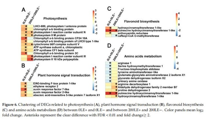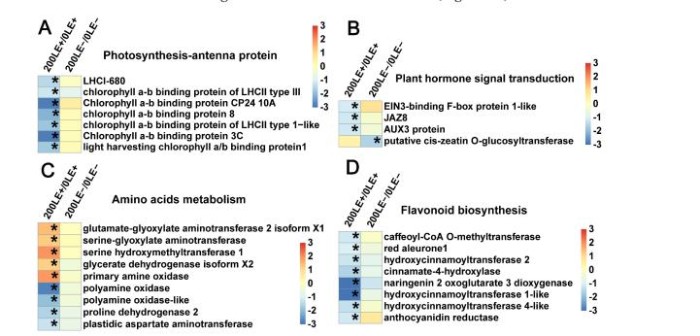 E.gansuensis顯著激活10個基因和5個光合作用基因分別為0mM和200mMNaCl濃度下。E.gansuensis的作用寄主植物的光合作用基因更明顯在0mMNaCl下比200mM氯化鈉(圖6A)。此外,E.gansuensis顯著激活植物的五個信號傳導(dǎo)基因在0mMNaCl濃度下;這些基因包括乙烯信號通路的兩個基因、生長素信號通路的兩個基因和脫落酸信號通路的一種基因。然而,E.gansuensis沒有顯著激活植物激素信號轉(zhuǎn)導(dǎo)基因在200mMNaCl濃度13下(圖6B),這意味著NaCl的影響大于E.gansuensis在植物激素基因表達方面的研究。E.gansuensis顯著下激活植物激素信號轉(zhuǎn)導(dǎo)基因在0mMNaCl濃度下,但E.gansuensis在200mMNaCl濃度下顯著調(diào)控兩個類黃酮生物合成基因(圖6C)。E.gansuensis顯著抑制氨基的八個基因在0mMNaCl濃度和E.gansuensis的酸代謝顯著激活下激活植物激素信號轉(zhuǎn)導(dǎo)基因在200mMNaCl濃度下的(圖6D)。更遠,E.gansuensis顯著下調(diào)甘氨酸、絲氨酸和蘇氨酸代謝,以及作為色氨酸代謝在0mMNaCl濃度下。E.gansuensis顯著下調(diào)賴氨酸降解,上調(diào)精氨酸和脯氨酸代謝在200mMNaCl下。因此,很可能,E.gansuensis通過調(diào)節(jié)宿主氨基酸代謝來提高A.inebrians的耐鹽性。