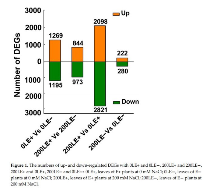 進一步闡明E.gansuensis在NaCl脅迫下對寄主植物生長的分子機制,E+和E-A.inebrians葉片(28天齡)的轉(zhuǎn)錄組通過Illumina測序進行分析。E+A.inebrians和E-A.inebrians用含0mMNaCl和200mMNaCl濃度處理。閾值FDR≤0.01和FC≥2用于確定DEG(差異表達基因)。結(jié)果顯示響應(yīng)E.gansuensis的轉(zhuǎn)錄本發(fā)生顯著變化,在0mMNaCl和200mMNaCl濃度下的分別發(fā)生2464和1817DEGs(圖1)。此外,在NaCl脅迫下,轉(zhuǎn)錄本發(fā)生了顯著變化,E+葉子的4919個DEG。然而,一個小的轉(zhuǎn)錄組變化發(fā)生在對NaCl脅迫的響應(yīng),E-葉為502DEG(圖1)。