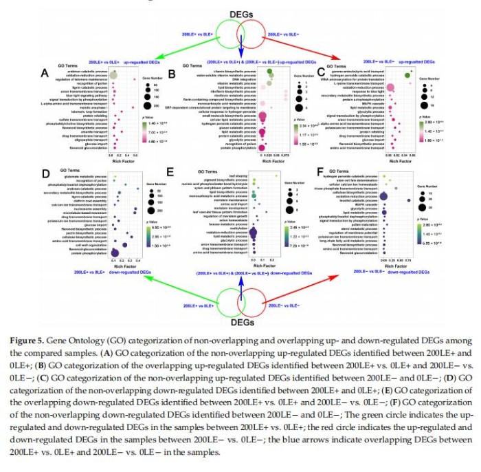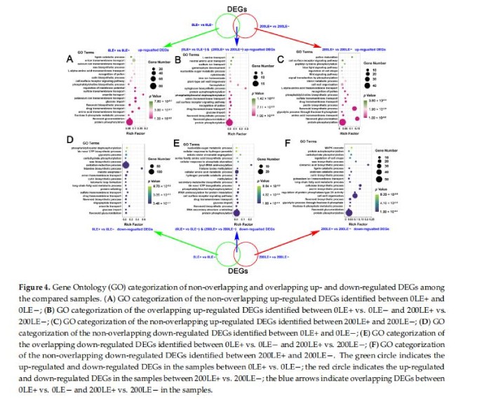 Venn結(jié)果顯示E.gansuensis僅上調(diào)1135DEG在0mMNaCl濃度下的LE+和LE-之間,E.gansuensis在200mMNaCl脅迫下僅上調(diào)LE+和LE-之間的710DEG;此外,134DEG的LE+與LE-在E.gansuensis在0mMNaCl和200mMNaCl(補充圖S4A)。同樣,E.gansuensis在0mMNaCl和E.gansuensis僅下調(diào)LE+和LE-之間的928DEG僅在A.inebrians中下調(diào)LE+和LE-之間的706DEG作為響應(yīng)至200mMNaCl(補充圖S4B)。分析結(jié)果表明這些特殊的上調(diào)或下調(diào)的LE+與LE-的DEG的GO富集0mMNaCl和200mMNaCl分別顯示磷酸化信號,次生代謝物的合成和轉(zhuǎn)運,以及離子跨膜轉(zhuǎn)運A.inebrians主要富集于E.gansuensis獨特的上調(diào)DEGs在0mMNaCl濃度下(圖4A)。GO富集分析結(jié)果表明A.inebrians的“蛋白質(zhì)磷酸化”、“類黃酮葡萄糖醛酸化”、“氨基酸跨膜轉(zhuǎn)運”、“果糖6-磷酸代謝過程”、“類黃酮生物合成過程”和“磷酸化信號轉(zhuǎn)導(dǎo)”主要在200mM甘肅E.gansuensis獨特的上調(diào)DEG中富集NaCl濃度(圖4C)。細胞信號轉(zhuǎn)導(dǎo)通路(“蛋白磷酸化”和“細胞表面受體信號通路”)、“類黃酮生物合成A.inebrians的“過程”、“細胞表面受體信號通路”、“葡萄糖輸入”、“陰離子跨膜轉(zhuǎn)運”和“細胞分裂”主要富集于E.gansuensis在0mMNaCl和200mMNaCl濃度下共享上調(diào)的DEG(圖4B)。E.gansuensis主要僅抑制“黃酮類葡萄糖醛酸化”、“葡萄糖輸入”、“長鏈脂肪酸代謝過程”、“黃酮類生物合成過程”、“陰離子跨膜轉(zhuǎn)運”和“氧化還原過程”的A.inebrians,主要在獨特的下調(diào)DEG中富集由E.gansuensis在0mMNaCl濃度下(圖4D)。“蛋白質(zhì)磷酸化”、“果糖6-磷酸代謝過程”、“黃酮類葡萄糖醛酸化”、“通過果糖-6-磷酸進行糖酵解過程”,“類黃酮生物合成過程”,“調(diào)節(jié)蛋白磷酸酶2A型活性”,“鉀離子跨膜”A.inebrians的運輸”和“MAPK級聯(lián)”主要富集于獨特的甘肅大腸桿菌在200mMNaCl濃度下下調(diào)DEG(圖4F)。細胞信號轉(zhuǎn)導(dǎo)(“蛋白質(zhì)磷酸化”和“細胞表面受體信號通路”)、次生代謝產(chǎn)物(“類黃酮”生物合成過程”、“絲氨酸家族氨基酸生物合成過程”和“細胞氨基酸代謝過程”)和“過氧化氫分解代謝過程”A.inebrians主要在0mMNaCl和200mMNaCl的E.gansuensis共享的下調(diào)DEG中富集(圖4E)。