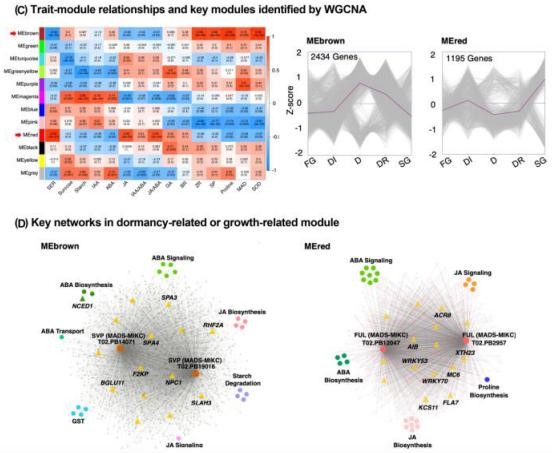 為了了解基因和通路的動(dòng)態(tài)變化,并識(shí)別鳶尾越冬性休眠過(guò)程中的休眠相關(guān)模塊,我們對(duì)IJ的所有15118個(gè)差異轉(zhuǎn)錄本進(jìn)行了WGCNA分析,共鑒定出12個(gè)共表達(dá)模塊.對(duì)每個(gè)模塊進(jìn)行了主要的表達(dá)趨勢(shì)和KEGG富集分析。并進(jìn)行模塊-形狀關(guān)聯(lián)分析,選擇形狀特異性模塊和階段特異性模塊。結(jié)果中找到分別與冬季生長(zhǎng)率呈顯著正、負(fù)相關(guān)的生長(zhǎng)模塊(red)和休眠模塊(brown),MADS-box家族基因FUL/AP1和SVP分別位于兩個(gè)模塊,并與植物激素合成與信號(hào)轉(zhuǎn)導(dǎo)、碳水化合物代謝和環(huán)境響應(yīng)通路基因共表達(dá)。
