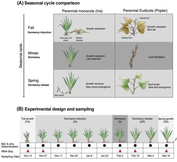 冬季休眠是植物應(yīng)對(duì)潛在致命環(huán)境的最關(guān)鍵策略。近幾十年來(lái),由于氣候的變化,在經(jīng)濟(jì)上具有重要意義的多年生雙子葉植物中的這一過(guò)程得到了廣泛的研究。然而,在不需要冷卻的常綠單子葉植物中,休眠過(guò)程至今仍是一個(gè)謎。因此,揭示這些單子葉植物越冬休眠的調(diào)控機(jī)制,不僅有助于更好地開(kāi)發(fā)利用植物資源,而且對(duì)應(yīng)對(duì)全球變暖帶來(lái)的低溫不足的挑戰(zhàn)具有重要意義。通過(guò)多年物候觀測(cè)發(fā)現(xiàn),鳶尾和蝴蝶花越冬休眠過(guò)程均僅有生態(tài)休眠,將休眠植株移至適宜條件下能迅速恢復(fù)生長(zhǎng),且在同一栽培地區(qū)二者越冬休眠期存在明顯差異,是研究多年生單子葉植物越冬休眠機(jī)理的理想材料。本研究比較了鳶尾(I.tectorum)和蝴蝶花(I.japonica)在關(guān)鍵發(fā)育時(shí)間點(diǎn)的休眠過(guò)程。這兩種鳶尾都表現(xiàn)出短暫的休眠過(guò)程,且持續(xù)時(shí)間不同,在溫暖條件下都能很容易地恢復(fù)生長(zhǎng)。為了破譯轉(zhuǎn)錄變化,作者對(duì)鳶尾進(jìn)行了全長(zhǎng)測(cè)序,對(duì)蝴蝶花進(jìn)行了RNA-seq測(cè)序,分別生成參考轉(zhuǎn)錄組,揭示了調(diào)控常綠與落葉類(lèi)鳶尾越冬休眠的分子機(jī)制。
