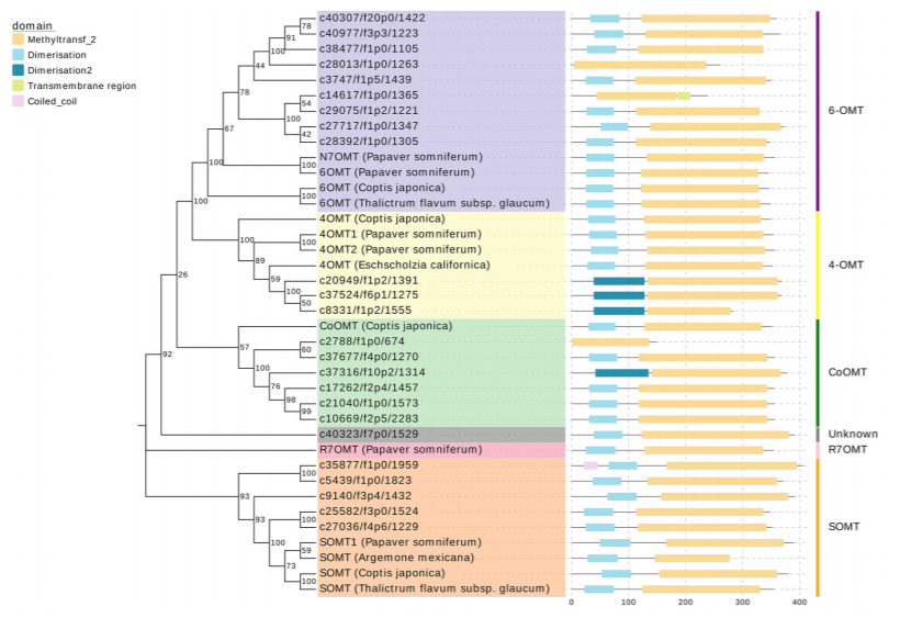 進(jìn)一步研究發(fā)現(xiàn),其中參與合成具有廣泛臨床鎮(zhèn)痛潛力的關(guān)鍵代謝物四氫巴馬汀的酶可能與唯一已知的黃連中負(fù)責(zé)催化這一步反應(yīng)的ColumbamineO-methyltransferase(CoOMT)存在較大的蛋白質(zhì)序列差異。通過(guò)系統(tǒng)發(fā)生樹分析,作者們推斷出至少存在10種unigenes的翻譯產(chǎn)物可能催化四氫巴馬汀的合成。 特異性的氧甲基化是四氫巴馬汀與紫堇達(dá)明合成的關(guān)鍵,延胡索中是否存在特殊的一類OMT或者具有不同底物特異性的OMT則是接下來(lái)將要重點(diǎn)解析的重點(diǎn)。
