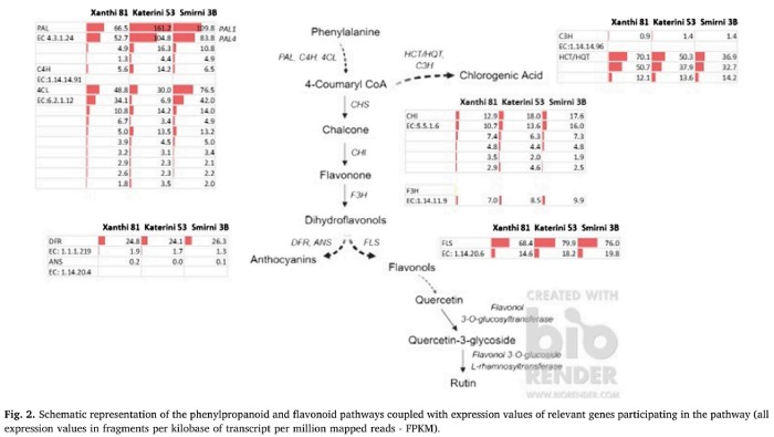 查爾酮合酶(CHS)是類黃酮生物合成中的關(guān)鍵酶。研究者發(fā)現(xiàn)兩個(gè) CHS基因在三個(gè)煙草品種的葉片中均低表達(dá),因?yàn)?CHS 主要在花中組成性表達(dá),但其表達(dá)主要是由非生物/生物脅迫誘導(dǎo)的。注釋為 CHS-1B 或 CHS2 的Nitab4.5_0002920g0060.1 在’Katerini 53’和’Xanthi 81’中略有上調(diào),但第二個(gè)注釋為 III 型聚酮化合物合酶(NCBI:XP_016446648.1)差異很小。所有 CHI 基因也僅以低水平表達(dá),在鑒定的結(jié)果中 F3H 也沒有差異。另一方面,鑒定了兩個(gè)參與黃酮醇形成的 FLS 基因。FLS1(Nitab4.5_0005357g0020.1)(NCBI:LOC107794305)的表達(dá)最高,而 NtFLS(Ni-tab4.5_0006276g0010.1)的表達(dá)低得多。這兩個(gè)基因在品種之間沒有差異表達(dá)。還檢測(cè)到有助于花色苷生物合成的基因,例如 DFR 和 ANS。DFR 中第一個(gè)僅適度表達(dá),另外一個(gè)沒有差異。ANS(Nitab4.5_0003274g0110.1)幾乎未表達(dá)(圖 2)。蘆丁是一種黃酮醇糖苷,在花青素途徑生物合成,其中包括黃酮醇 3-O-葡萄糖基轉(zhuǎn)移酶和黃酮醇 3-O-葡萄糖苷胰島素轉(zhuǎn)移酶。結(jié)果表明低表達(dá)的 4 種黃酮醇 3-O-糖基轉(zhuǎn)移酶和 2種黃酮醇 3-O-糖苷胰島素轉(zhuǎn)移酶在“Smirrni 3B”和“Xanthi 81”比“Katerini 53”中表達(dá)更高、更多。