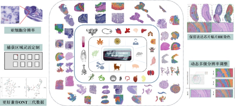 百創(chuàng)智造自主研發(fā)的基于微孔微珠的亞細胞級分辨率空間轉錄芯片BMKMANU S1000,包含1~8個捕獲區(qū)域,可在亞細胞分辨率水平上,檢測完整組織切片中的原位基因表達信息,實現(xiàn)組織結構的精細解讀。同時支持100μm~4,8μm多級分辨率的調整,并且支持HE染色,能更好觀察組織病理形態(tài),目前已在上百例組織樣本中得到性能驗證。