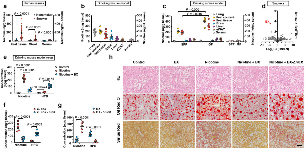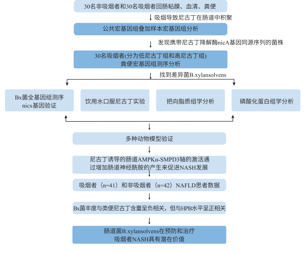 該研究發(fā)現(xiàn)尼古丁在吸煙期間在腸道中積聚并加速NAFLD的進(jìn)展,但它可以被人類(lèi)共生菌B.xylansolvens有效降解。揭示了了腸道尼古丁積累的病理影響,并確定了一種內(nèi)源性尼古丁降解腸道細(xì)菌,該細(xì)菌對(duì)預(yù)防和治療吸煙者的NASH具有潛在價(jià)值。