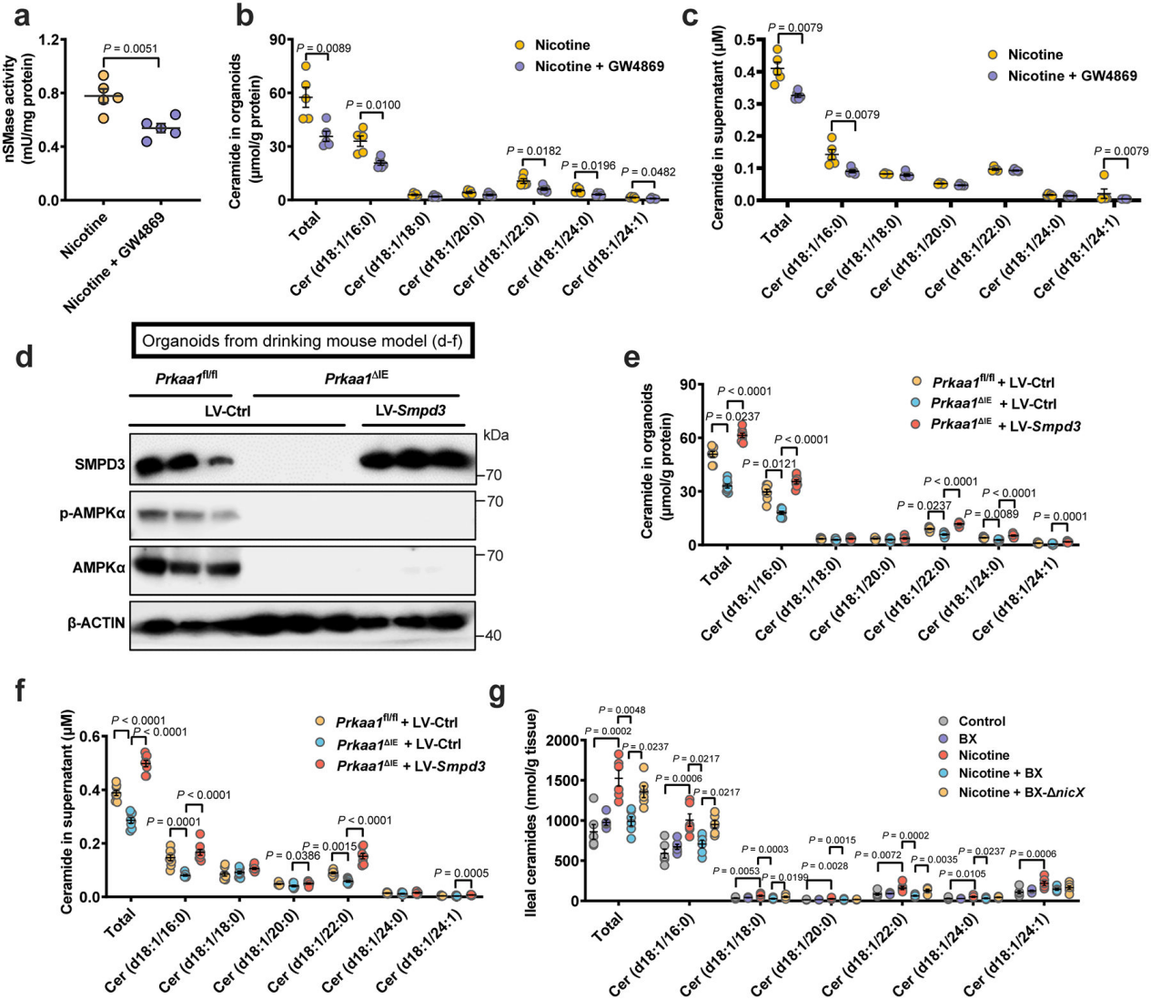 SMPD3的過(guò)表達(dá)逆轉(zhuǎn)了由于回腸器官中AMPKa1缺乏而導(dǎo)致的神經(jīng)酰胺水平的降低。在尼古丁加速的NASH小鼠模型中,在B.xylanisolvens存在的情況下,被B.xylansolvens定植的SPF小鼠回腸神經(jīng)酰胺減少。此外,口服GW4869降低了回腸神經(jīng)酰胺的水平,并且在尼古丁飲用模型中伴隨著較低的NAFLD嚴(yán)重程度。尼古丁誘導(dǎo)的腸道AMPKa-SMPD3軸的激活通過(guò)增加腸道神經(jīng)酰胺的產(chǎn)生來(lái)促進(jìn)非酒精性脂肪肝的進(jìn)展,因此抑制SMPD3是一種潛在的緩解肝臟脂肪變性、炎癥和纖維化的策略。