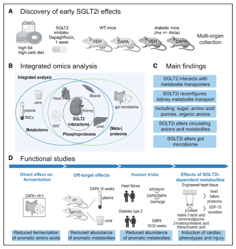 丹麥奧胡斯大學(xué)學(xué)者在Circulation雜志上發(fā)表題為“Metabolic Communication by SGLT2 Inhibition“研究論文,研究團(tuán)隊(duì)使用Akita小鼠模型和臨床隊(duì)列樣品,通過整合宏基因組、代謝組、蛋白組等多組學(xué)數(shù)據(jù),確定了SGLT2i對(duì)腎臟、心臟、血管和其他器官的幾種SGLT2依賴性效應(yīng)和脫靶效應(yīng),通過重構(gòu)腎臟代謝物轉(zhuǎn)運(yùn)和全身代謝通訊,發(fā)揮心腎保護(hù)作用。提供了關(guān)于SGLT2相互作用因子和SGLT2i依賴性蛋白質(zhì)組、代謝組、磷酸化蛋白質(zhì)組和宏蛋白質(zhì)組的新見解,從而為SGLT2i新型和早期機(jī)制靶標(biāo)提供了潛在的路線,促進(jìn)代謝藥物的開發(fā)。