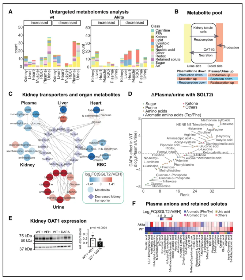 SGLT2抑制劑(SGLT2i)改變了腎蛋白質(zhì)組和磷酸蛋白質(zhì)組,同時(shí)調(diào)控其他代謝物轉(zhuǎn)運(yùn)蛋白。其抑制作用引起了血漿和尿液代謝物的顯著變化。因此,研究者提出腎蛋白質(zhì)組的重編程可能部分解釋了觀察到的代謝物變化。文章中指出了可能影響體液循環(huán)代謝物組成的多個(gè)過程,包括尿液排泄的改變(圖3B)。在WT小鼠中,SGLT2i在腎臟中減少了27種SLC的表達(dá)。結(jié)合這些結(jié)果和尿液代謝譜,表明了SGLT2i可能通過影響其他器官的代謝物組成,從而導(dǎo)致尿液中代謝物的變化(圖3C)。