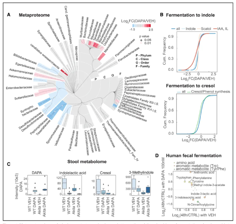 由于WT小鼠中SGLT2i改變的許多血漿溶質(zhì)是芳香族氨基酸的代謝物,因此分析了可以在蛋白質(zhì)組水平上代謝這些氨基酸的細(xì)菌的豐度。對(duì)于產(chǎn)生吲哚的細(xì)菌,發(fā)現(xiàn)表達(dá)色氨酸酶以從色氨酸產(chǎn)生吲哚的物種減少(吲哚丙烯酸;圖4B)。