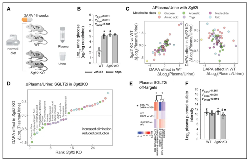 在SGLT2 KO和WT小鼠中,許多代謝物的比率發(fā)生了類似的變化,就像在WT小鼠中使用達(dá)格列凈和溶劑處理一樣(圖5C左圖),這表明SGLT2抑制的后果。在其他方面,葡萄糖比率的下降,反映了尿糖排泄的增加。正如預(yù)期的那樣,SGLT2的缺失阻斷了達(dá)格列凈對(duì)葡萄糖排泄的影響(圖5C右圖)。另一方面,達(dá)格列凈顯著改變了SGLT2 KO小鼠體內(nèi)許多代謝物的比例,表明了一種偏離靶點(diǎn)的效應(yīng)(圖5D)。血漿:尿液比例的排名變化顯示,達(dá)格列凈降低了SGLT2 KO小鼠中多種芳香酸代謝物的比例,包括甲酚和馬尿酸鹽,其次是色氨酸代謝物。血漿水平分析確定了SGLT2i在SGLT2 KO環(huán)境中顯著改變的5種代謝物,包括PCL硫酸鹽和一種修飾的馬尿酸(圖5E和5F)。該實(shí)驗(yàn)表明SGLT2i治療具有非靶點(diǎn)效應(yīng),包括對(duì)甲酚、馬尿酸鹽和色氨酸代謝物。