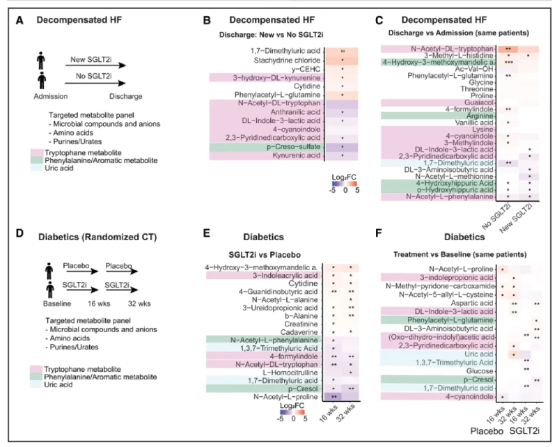 鑒于腎臟SGLT2相互作用組以及微生物對(duì)SGLT2i的反應(yīng)在小鼠和人類中相似,我們想知道SGLT2i是否會(huì)影響循環(huán)中的溶質(zhì),在縱向數(shù)據(jù)中與心血管相關(guān)。對(duì)來自2個(gè)獨(dú)立研究的患者的血漿樣本進(jìn)行了靶向代謝組分析,目標(biāo)是80個(gè)有機(jī)陰離子和尿毒癥毒素。在第一組>40名患者中,在失代償性心衰的真實(shí)環(huán)境中分析了這種影響(圖6A)。結(jié)果表明,SGLT2i顯著降低或鈍化了心力衰竭患者血漿中幾種有機(jī)陰離子的增加,但僅當(dāng)住院期間添加SGLT2i時(shí)(圖6B和6C)。包括幾種色氨酸代謝物,如ILA、犬尿酸和乙酰色氨酸,以及苯丙氨酸代謝物苯乙酰谷氨酰胺和PCL硫酸鹽。分析了在糖尿病患者中使用SGLT2I(依帕列凈)的隨機(jī)對(duì)照試驗(yàn)的縱向數(shù)據(jù)(圖6D)。與基線和安慰劑相比,二甲基尿酸和三甲基尿酸的血漿濃度降低,PCL降低,吲哚代謝物增加緩慢(圖6E和6F)。在兩項(xiàng)臨床研究中,降低的溶質(zhì)大部分來自嘌呤代謝和腸道芳香氨基酸代謝,這與在小鼠身上觀察到的代謝器官一致。