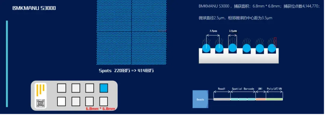 百創(chuàng)S3000在6.8mm*6.8mm 的捕獲區(qū)域內(nèi)鋪設(shè)了4,144,770個(gè)捕獲位點(diǎn),相鄰兩個(gè)捕獲位點(diǎn)的中心距為3.5μm。