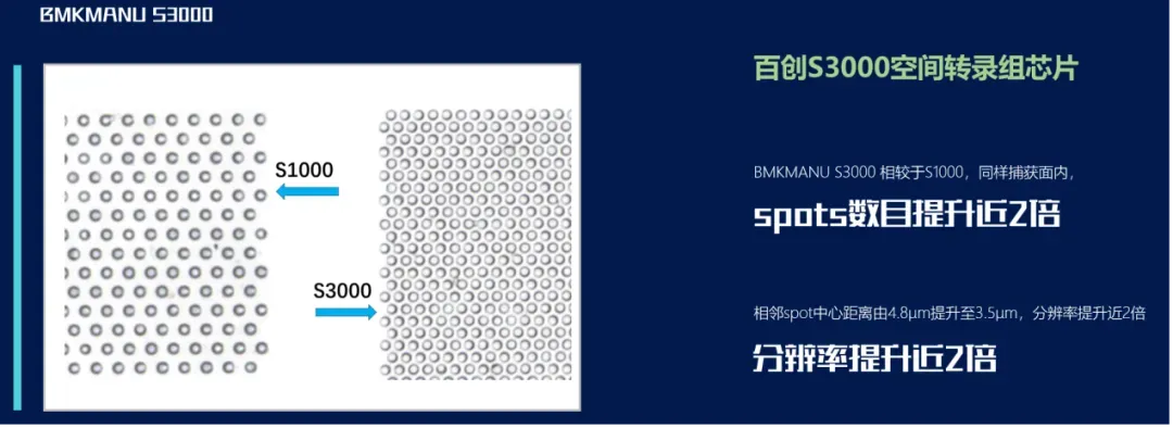 相較于現(xiàn)在廣受市場(chǎng)認(rèn)可與好評(píng)的百創(chuàng)S1000轉(zhuǎn)錄組芯片,捕獲位點(diǎn)數(shù)提升近2倍,分辨率同樣提升近2倍。
