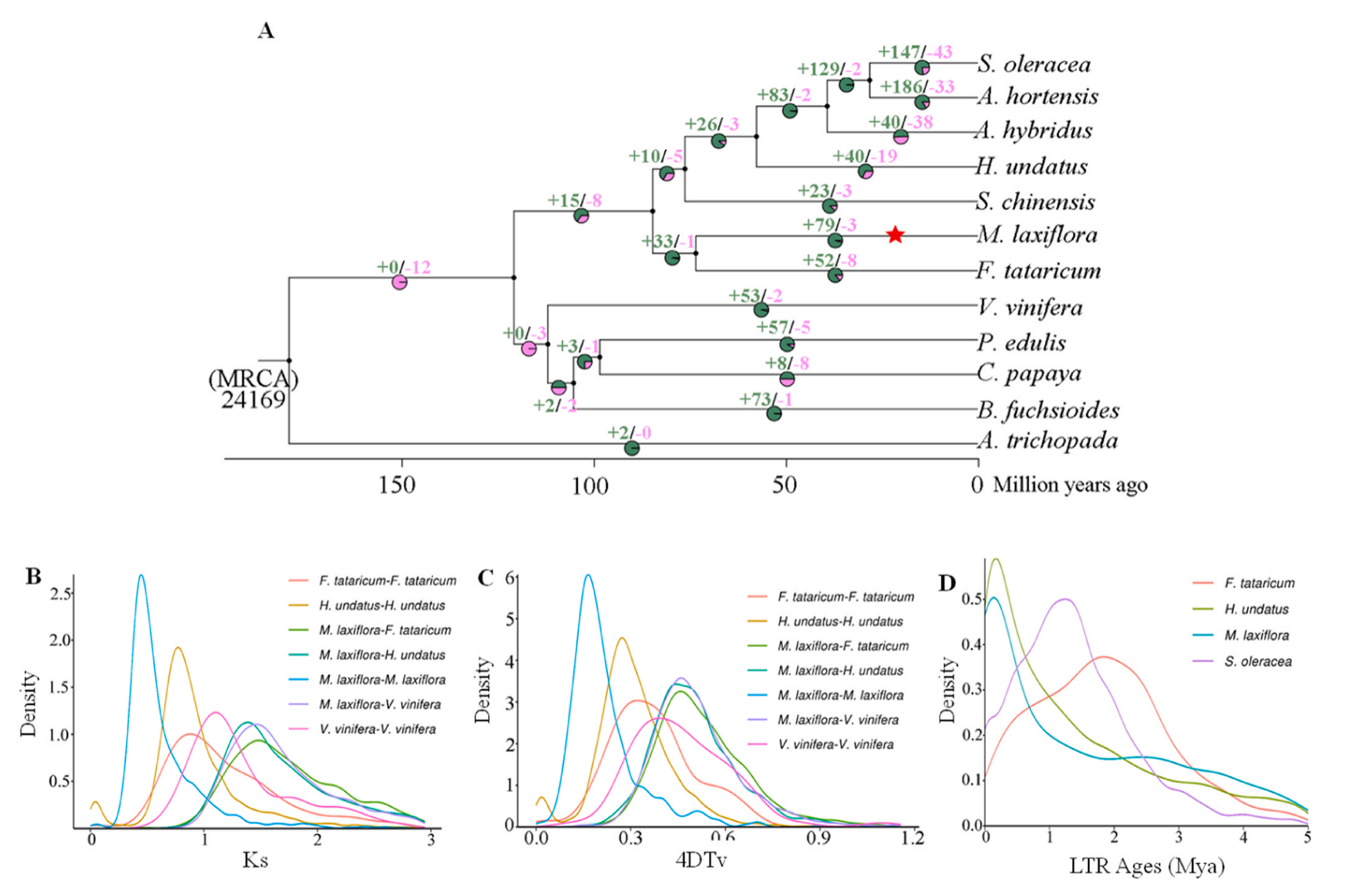 比較基因組研究發(fā)現(xiàn)疏花水柏枝與苦蕎(F. tataricum)的親緣關系最為密切,大約在65-81百萬年前(Mya)發(fā)生分化;在19.74 ~ 24.60 Mya之間發(fā)生了一次全基因組復制(WGD), 4dTV分析證實了這一點。在0.15 Mya左右存在一個長末端重復(LTR)插入。這些基因組變化可能與疏花水柏枝在進化過程中所經(jīng)歷的環(huán)境劇變(如青藏高原隆升)有關?;蚣易宸治鲲@示疏花水柏枝的特有基因家族與能量代謝和信號轉導密切相關;85個基因在疏花水柏枝基因組中經(jīng)歷了正選擇,這些基因在與氨基酸合成和代謝相關的KEGG通路中顯著富集。