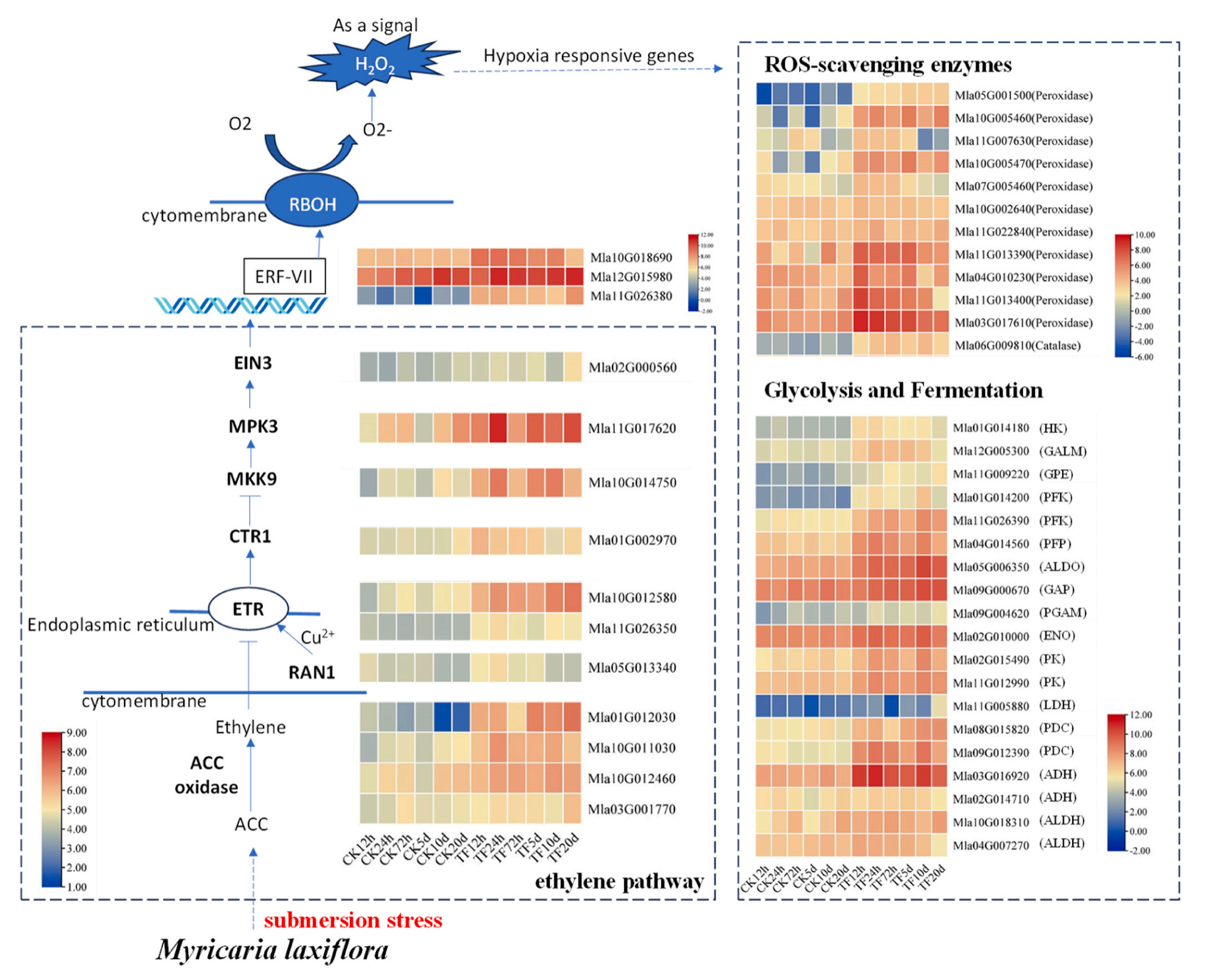 作者通過比較水淹和對照條件下疏花水柏枝形態(tài)、生理和轉錄組學的變化,分析了植物對水淹的適應機制??傮w而言,在完全淹沒的狀態(tài)下,疏花水柏枝采用“靜止”的策略。具體來說,在淹水條件下,光合作用減弱,生長停滯,糖酵解被激活,抗氧化酶系統(tǒng)增強。乙烯反應途徑可能是這一過程的調控因子,MlERF-VII基因(Mla11G026380)可能是調控這一過程的關鍵基因。
