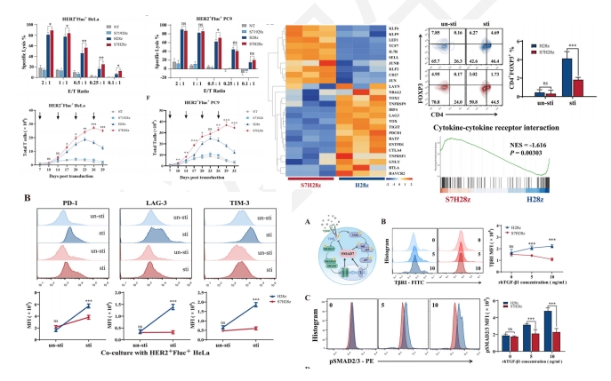 關(guān)于CAR-T細(xì)胞中TGF-β信號(hào)通路的調(diào)控作用,作者結(jié)合流式細(xì)胞檢測(cè)結(jié)果發(fā)現(xiàn),與傳統(tǒng)的CART細(xì)胞在暴露于增加濃度的rhTGF-β1時(shí)TβRI顯著上調(diào)不同,共同表達(dá)SMAD7的細(xì)胞在rhTGF-β1處理后TβRI(TGF-β受體)水平是下降的,RNA-seq和qPCR檢測(cè)表明,在HER2+腫瘤細(xì)胞刺激后,與對(duì)照組CAR-T細(xì)胞相比,共表達(dá)SMAD7的CAR-T細(xì)胞中細(xì)胞因子的產(chǎn)生顯著減少,即SMAD7阻礙了CAR-T細(xì)胞中細(xì)胞因子的合成。