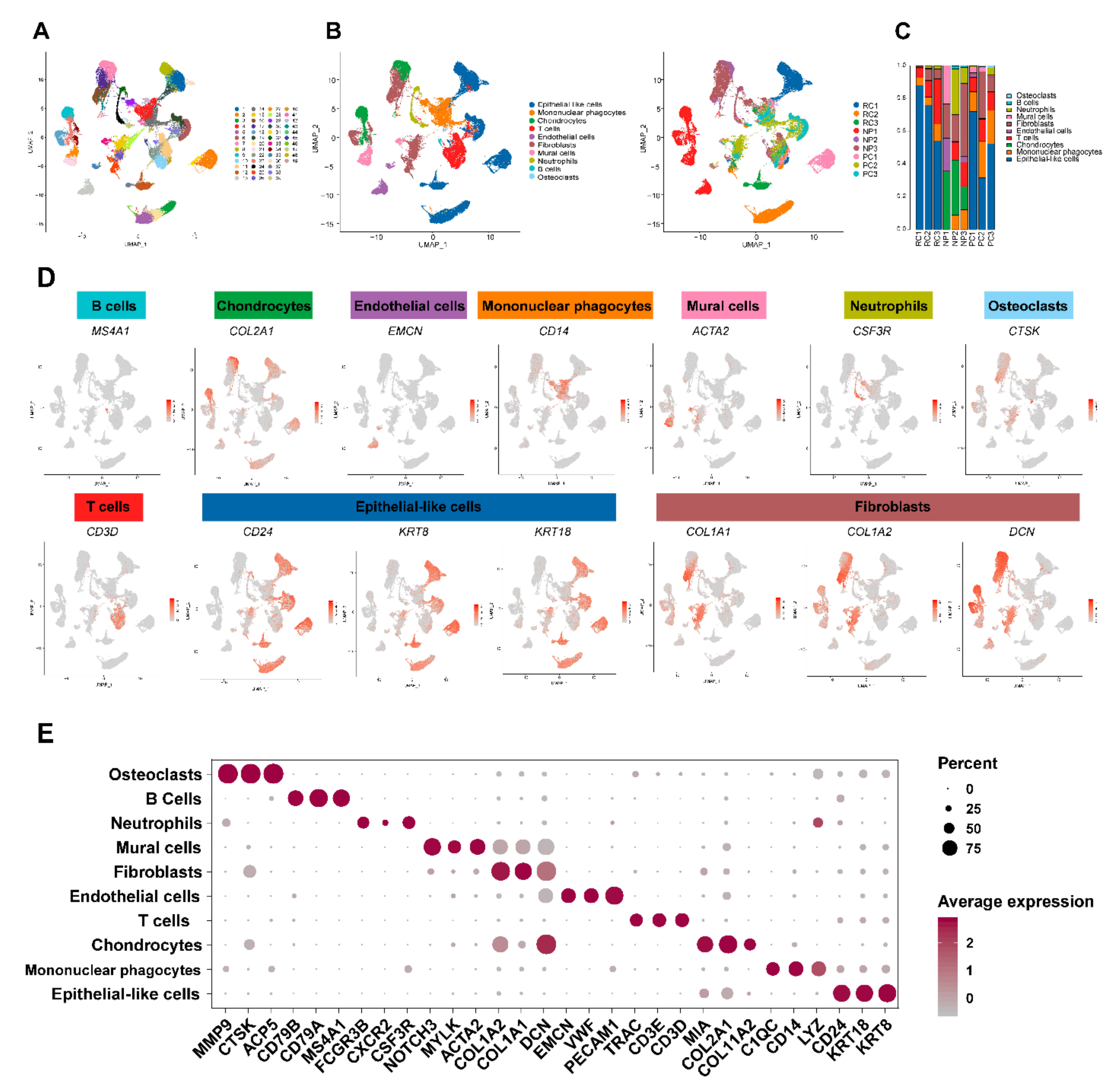 該研究通過(guò)生成 6 名脊索瘤患者(包括 3 名原發(fā)性腫瘤和 3 名復(fù)發(fā)性腫瘤)和 3 名匹配的 LDH 患者組織的單細(xì)胞基因表達(dá)譜,總共獲得72097個(gè)細(xì)胞,其中46987個(gè)細(xì)胞來(lái)自脊索瘤,25110個(gè)來(lái)自NP組織樣本。如圖1A-B所示,a總共鑒定了49個(gè)細(xì)胞簇,這些簇的注釋導(dǎo)致了10種細(xì)胞類(lèi)型的分離。被鑒定為上皮樣細(xì)胞、成纖維細(xì)胞、T 細(xì)胞和 B 細(xì)胞的細(xì)胞屬于多個(gè)簇,表明這些細(xì)胞類(lèi)型是異質(zhì)的(圖 1B)。與NP組織相比,脊索瘤組織中存在較多上皮樣細(xì)胞,尤其是復(fù)發(fā)腫瘤中。此外,原發(fā)性和復(fù)發(fā)性脊索瘤均顯示軟骨細(xì)胞、成纖維細(xì)胞和內(nèi)皮細(xì)胞比例下降(圖 1C)。10 個(gè)細(xì)胞亞群的代表性基因的表達(dá)如圖 1D-E 所示。這些結(jié)果共同表明上皮樣細(xì)胞代表腫瘤細(xì)胞。