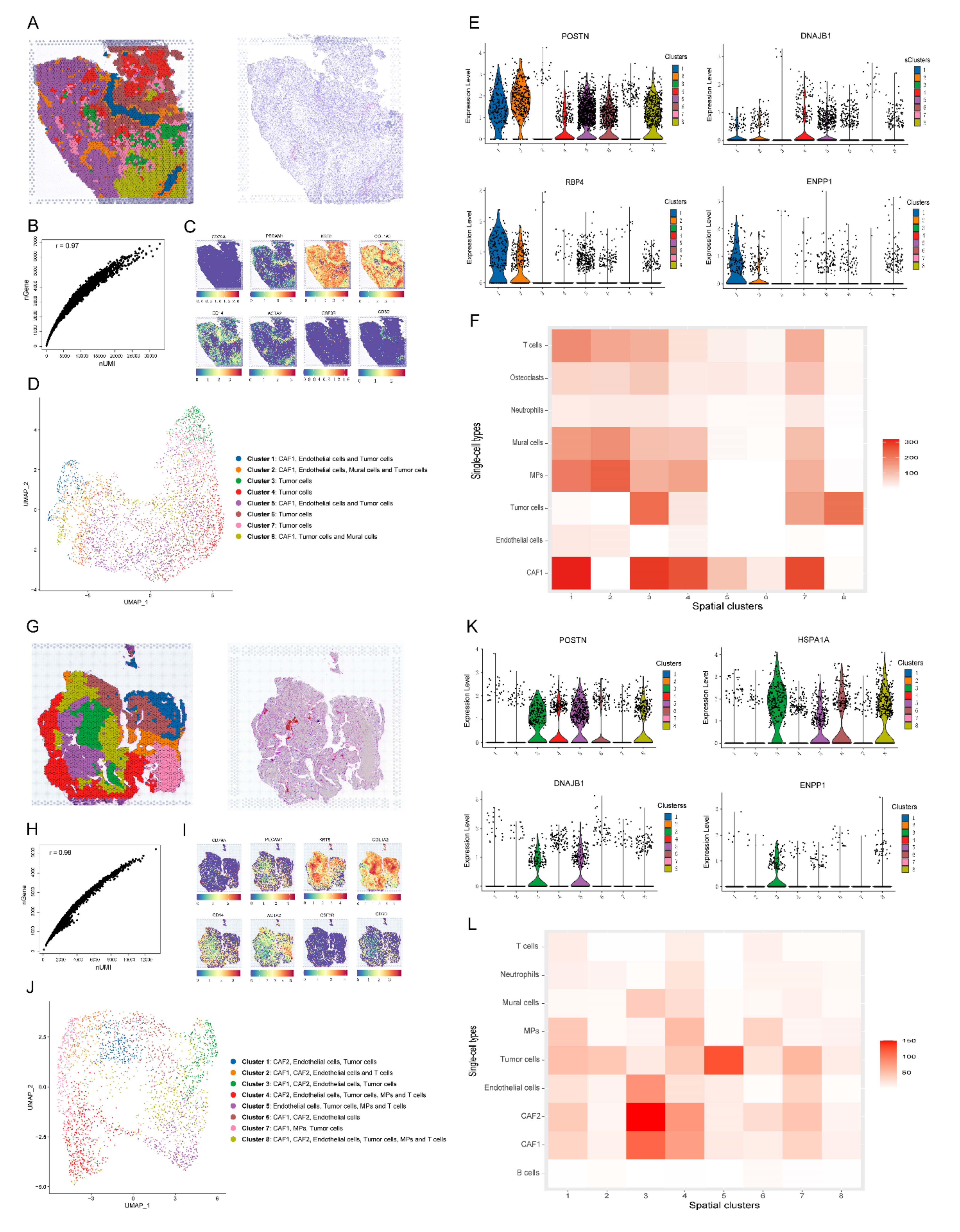 為了進(jìn)一步剖析脊索瘤組織中 ERS-CAF 的空間特征,該研究對(duì) 3 個(gè)新鮮腫瘤樣本(包括 2 個(gè)原發(fā)腫瘤和 2 個(gè)復(fù)發(fā)腫瘤)進(jìn)行了空間轉(zhuǎn)錄組測(cè)序;圖 6A 和 G )。在 ST 數(shù)據(jù)中觀(guān)察到 UMI 和標(biāo)記基因之間存在很強(qiáng)的相關(guān)性(圖 6B 和 H),表明質(zhì)量令人滿(mǎn)意。上皮樣細(xì)胞(KRT8)、單核吞噬細(xì)胞(CD14)、T細(xì)胞(CD3D)、內(nèi)皮細(xì)胞()的標(biāo)記基因PECAM1)、中性粒細(xì)胞(CSF3R)、B 細(xì)胞(CD79A)、成纖維細(xì)胞(COL2A1)和壁細(xì)胞(ACTA2)在 ST 數(shù)據(jù)中檢測(cè)到(圖 6C 和 I)。隨后,通過(guò) UMAP 方法降維,在原發(fā)性和復(fù)發(fā)性腫瘤樣本中識(shí)別出 8 個(gè)主要細(xì)胞簇(圖 6D 和 J)。作者在原發(fā)性腫瘤中觀(guān)察到 CAF 簇 1,而在復(fù)發(fā)腫瘤標(biāo)本中觀(guān)察到 CAF 簇 1 和 ERS-CAF(圖 6D 和 J)。這些發(fā)現(xiàn)通過(guò) CAF 標(biāo)記基因表達(dá)分析(圖 6E 和 K)以及 MIA 結(jié)果(圖 6F 和 L)得到證實(shí)。