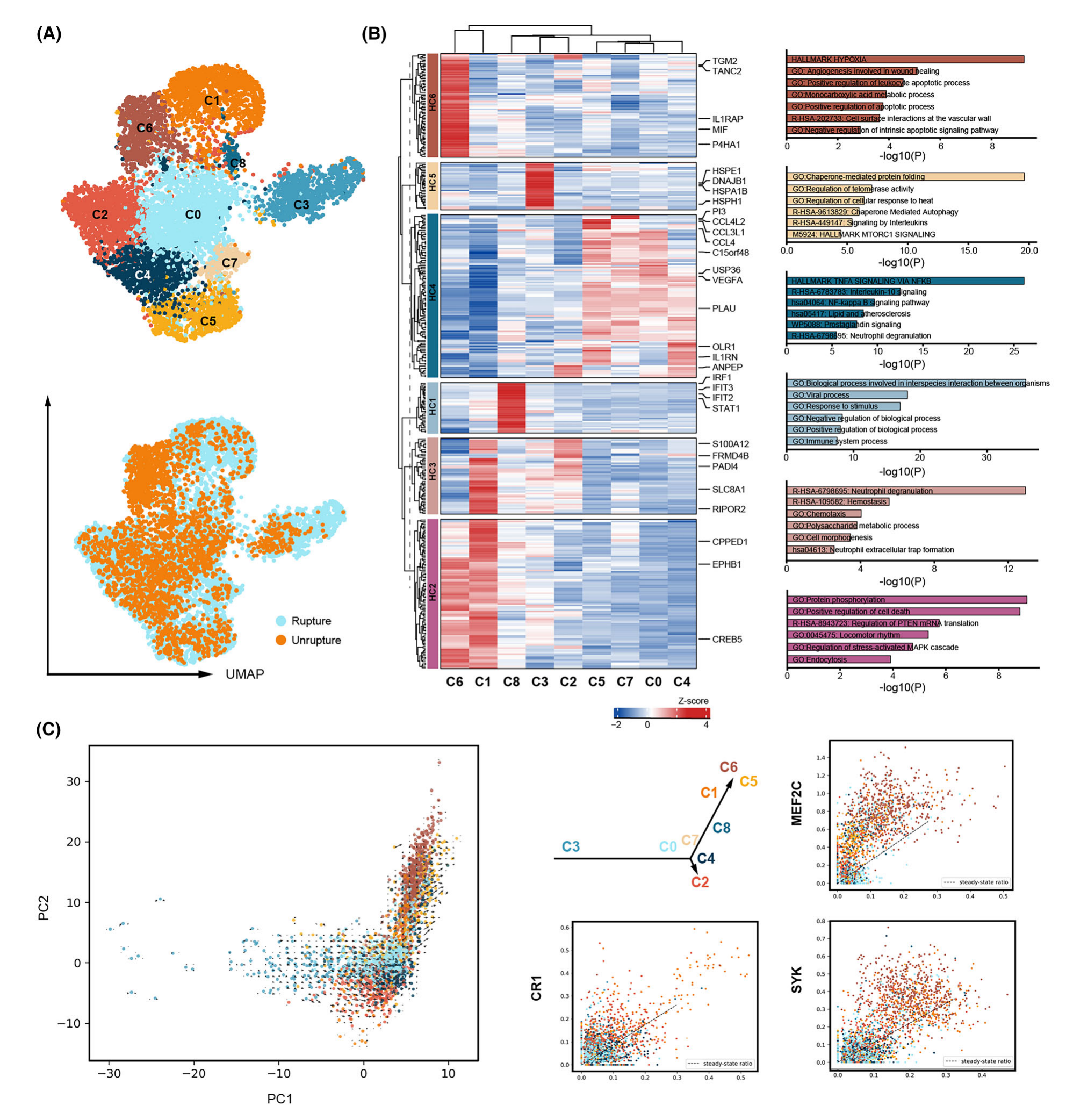 先前的研究表明中性粒細(xì)胞的功能和進(jìn)化具有異質(zhì)性,而IA穹隆中的中性粒細(xì)胞亞群仍然知之甚少。該研究使用“FindClusters”功能以更高分辨率(分辨率?=?0.9)重新聚類中性粒細(xì)胞,以識(shí)別不同的中性粒細(xì)胞群落。結(jié)果,鑒定出八個(gè)中性粒細(xì)胞亞群(C0-C7)(圖2A-B)。富集分析揭示了 C1 和 C6 中細(xì)胞凋亡途徑的正調(diào)節(jié)富集。具體而言,中性粒細(xì)胞胞外池?(NET) 的形成促進(jìn) IA 破裂,在 C1 中富集。對(duì)應(yīng)激反應(yīng)、脫顆粒和 NET 形成在 C8 中豐富,伴侶介導(dǎo)的蛋白質(zhì)折疊和自噬在 C3 中豐富,表明這些細(xì)胞也受到應(yīng)激。TNF、NF-κB 和中性粒細(xì)胞脫粒等通路在 C0、C4、C5 和 C7 中富集,表明這些細(xì)胞執(zhí)行中性粒細(xì)胞的促炎功能。此外,還進(jìn)行了 RNA 速度分析來描繪中性粒細(xì)胞亞簇的潛在軌跡。結(jié)果,這些細(xì)胞形成了包含兩個(gè)分支的軌跡。C5 和 C6 亞簇可能是軌跡的末端,CR1、MEF2C?和?SYK?參與細(xì)胞凋亡(圖 2C)。