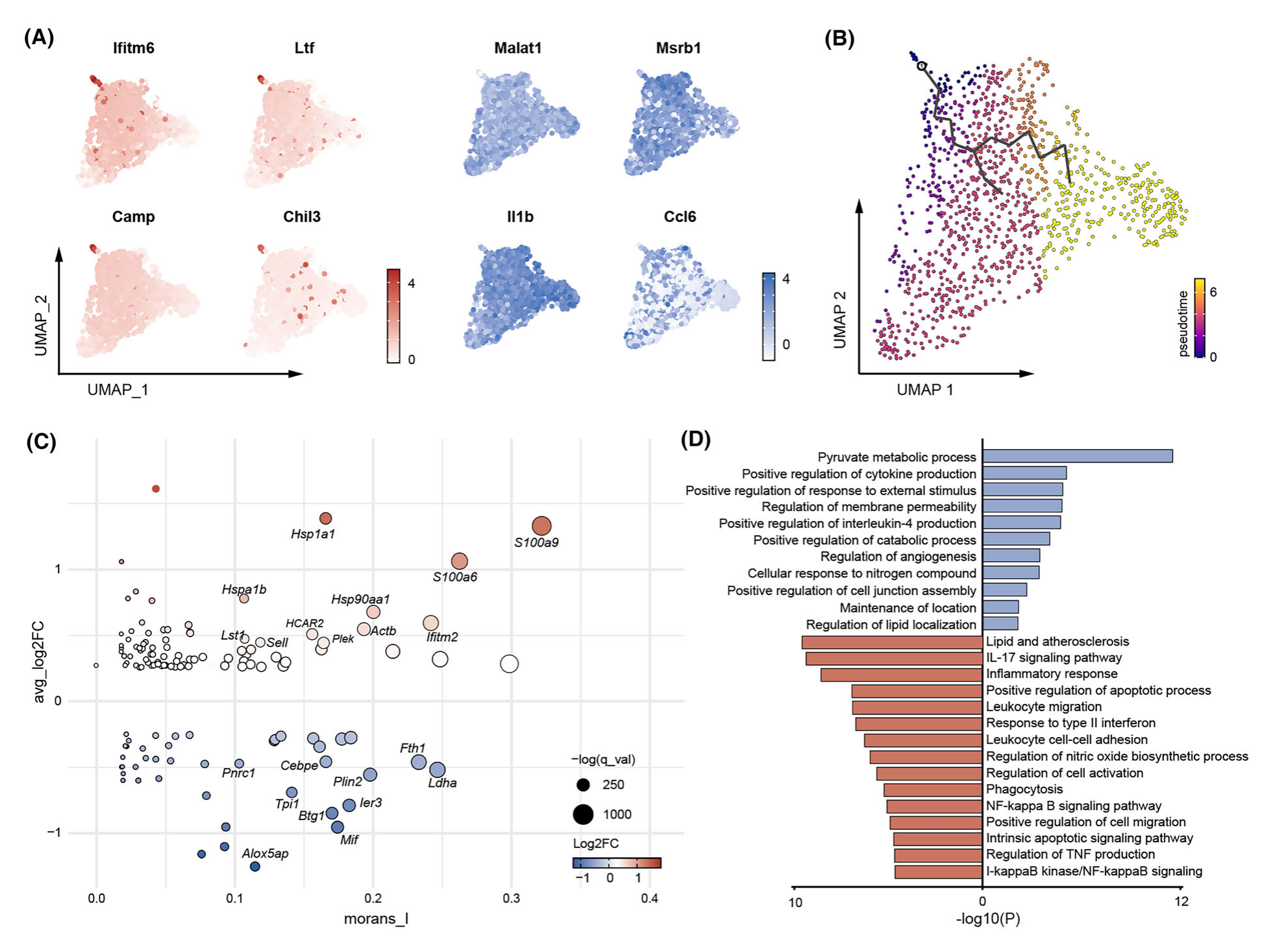 最近的研究根據(jù)中性粒細(xì)胞從骨髓到外周血的遷移決定了中性粒細(xì)胞的轉(zhuǎn)錄組特征,即“中性粒細(xì)胞”。該研究基于scRNA-Seq數(shù)據(jù)集研究了小鼠 IA 模型中性粒細(xì)胞浸潤(rùn)到IA組織時(shí)是否存在這種轉(zhuǎn)錄組特征。結(jié)果顯示假手術(shù)中存在少量中性粒細(xì)胞富集,并形成小鼠模型高表達(dá)的基因標(biāo)記,包括Ifitm6、Ltf、Camp?和?Chil3。這些細(xì)胞表達(dá)較低成熟或老化的基因標(biāo)記,如Malat1、Msrb1、Il1b和Ccl6(圖?3A),表明它們是從外周血新滲入的。執(zhí)行單片算法來識(shí)別細(xì)胞進(jìn)化軌跡,并將這些新滲透的細(xì)胞指定為起點(diǎn)(圖3B)。根據(jù)莫蘭斯指數(shù) (morans I) 以及未破裂(假手術(shù))和破裂小鼠模型中的基因表達(dá),該研究計(jì)算了 IA 組織中新浸潤(rùn)和老化中性粒細(xì)胞的基因特征(圖3C)。與之前的研究一致,新浸潤(rùn)的中性粒細(xì)胞高表達(dá)Cebpe,在粒細(xì)胞生成和炎癥因子產(chǎn)生中發(fā)揮作用,而相對(duì)老化的中性粒細(xì)胞表達(dá)S100a 家族基因和伴侶,如?Hspa1b、Has1a1?和?Hsp90aa1,表明壓力或衰老狀態(tài)。富集分析揭示了這些細(xì)胞的不同功能,新浸潤(rùn)的中性粒細(xì)胞中富集了多種代謝途徑,而老化的中性粒細(xì)胞則激活了炎癥和凋亡相關(guān)途徑(圖3D)??傊?,這些結(jié)果表明 IA 組織中存在中性粒細(xì)胞,并強(qiáng)調(diào)了它們的功能異質(zhì)性。