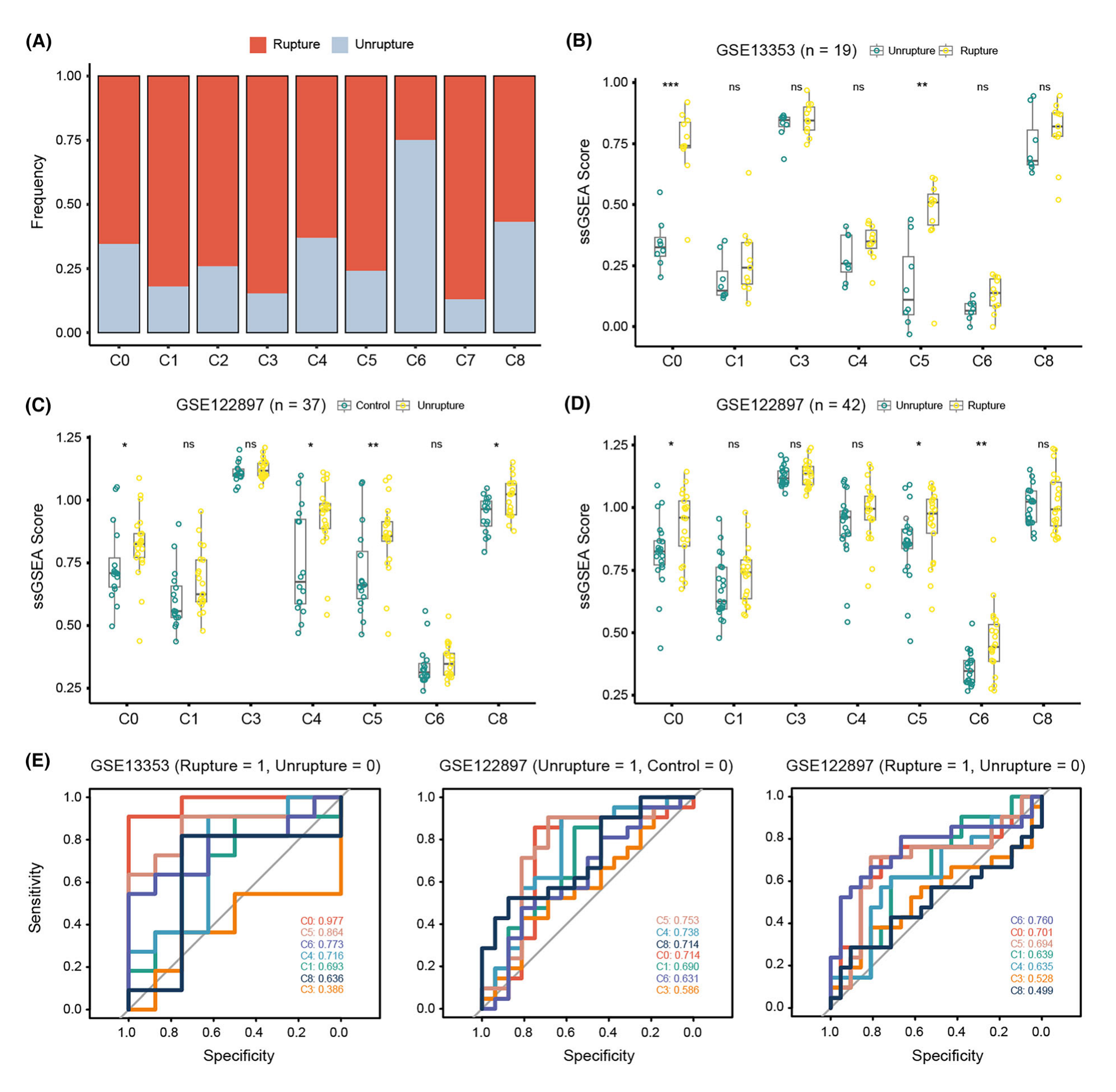 為了研究中性粒細(xì)胞浸潤(rùn)的病理意義,該研究首先展示了破裂和未破裂樣本中每種類型的中性粒細(xì)胞的比例。破裂樣本中除 C6 之外的中性粒細(xì)胞亞群有所增加(圖5A)。該研究進(jìn)一步整理了這些中性粒細(xì)胞的基因特征,發(fā)現(xiàn)C0和C5在破裂的IA組織中顯著富集(圖5B,D)。此外,與正常血管組織相比,未破裂 IA 中的 C0 和 C5 也顯著富集,與 C4 和 C8 相同(圖5C),表明中性粒細(xì)胞參與 IA 形成和破裂。接下來,進(jìn)行 ROC 分析以評(píng)估中性粒細(xì)胞亞群與 IA 形成和破裂之間的關(guān)聯(lián)。結(jié)果顯示C0和C6的ssGSEA評(píng)分在預(yù)測(cè)IA破裂方面產(chǎn)生了令人滿意的AUC值(兩個(gè)數(shù)據(jù)集中的AUC?>?0.7)(圖5E),表明這些細(xì)胞可能參與IA破裂。反過來,C4 和 C5 在預(yù)測(cè) IA 形成方面表現(xiàn)良好。在此基礎(chǔ)上,C0 和 C5 的局部滲透分別是 IA 破裂和形成的有力預(yù)測(cè)因子。