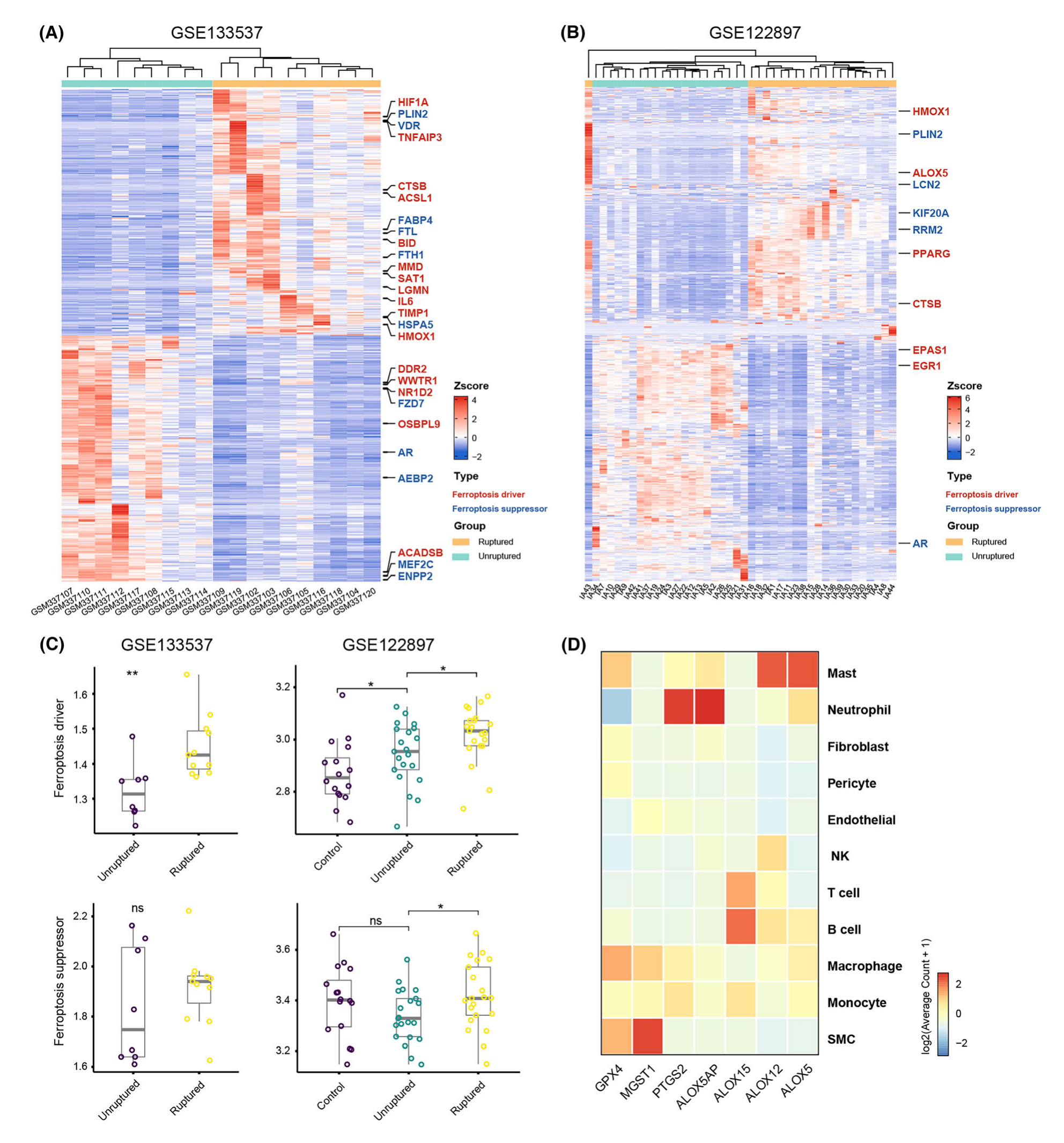 中性粒細(xì)胞介導(dǎo)的炎癥對(duì) IA 壁具有破壞性。最近,新出現(xiàn)的證據(jù)表明,中性粒細(xì)胞在某些情況下對(duì)鐵死亡敏感,這將進(jìn)一步促進(jìn)局部炎癥級(jí)聯(lián)反應(yīng)并促進(jìn) IA 進(jìn)展。在此,該研究描述了 IA 中中性粒細(xì)胞與鐵死亡之間的潛在關(guān)聯(lián)。該研究根據(jù)兩個(gè)批量轉(zhuǎn)錄組數(shù)據(jù)集計(jì)算了 DEG,并注釋了鐵死亡驅(qū)動(dòng)基因和抑制基因(圖 6A,B)。結(jié)果顯示在破裂的 IA 組織中,幾個(gè)鐵死亡驅(qū)動(dòng)基因和抑制基因有顯著差異,表明鐵死亡途徑失調(diào)。破裂的 IA 組織的鐵死亡驅(qū)動(dòng)基因 ssGSEA 評(píng)分高于未破裂組織,而抑制基因的 ssGSEA 評(píng)分相當(dāng)(圖6C),表明鐵死亡與 IA 破裂之間存在關(guān)聯(lián)。值得注意的是,未破裂的 IA 組織的鐵死亡驅(qū)動(dòng)基因得分高于對(duì)照樣本,表明鐵死亡也可能參與 IA 的形成。多個(gè)基因與中性粒細(xì)胞鐵死亡有關(guān),例如谷胱甘肽過氧化物酶 4(GPX4) 和微粒體谷胱甘肽 S 轉(zhuǎn)移酶 1 (MGST1) 充當(dāng)鐵死亡抑制劑;花生四烯酸脂氧合酶 5(ALOX5)、花生四烯酸脂氧合酶 5 激活蛋白(ALOX5AP)、花生四烯酸脂氧合酶 12(ALOX12)、花生四烯酸脂氧合酶 15(ALOX15) 和前列腺素 2(PTGS2) 充當(dāng)鐵死亡驅(qū)動(dòng)程序。在單細(xì)胞分辨率下,中性粒細(xì)胞高表達(dá)PTGS2和ALOX5AP(圖6D),它們與鐵死亡顯著相關(guān),表明這些細(xì)胞參與前列腺素和白三烯的產(chǎn)生,并且對(duì)鐵死亡敏感。盡管數(shù)量較少,但肥大細(xì)胞高度表達(dá) ALOX5 和 ALOX12。鑒于白三烯可以通過多細(xì)胞協(xié)同方式產(chǎn)生,局部白三烯可能是由中性粒細(xì)胞和肥大細(xì)胞以協(xié)同方式產(chǎn)生的??傊?,這些結(jié)果表明 IA 組織中中性粒細(xì)胞的鐵死亡可能是由 ALOX5AP 和 PTGS2 驅(qū)動(dòng)的,并且可以由肥大細(xì)胞促進(jìn)。