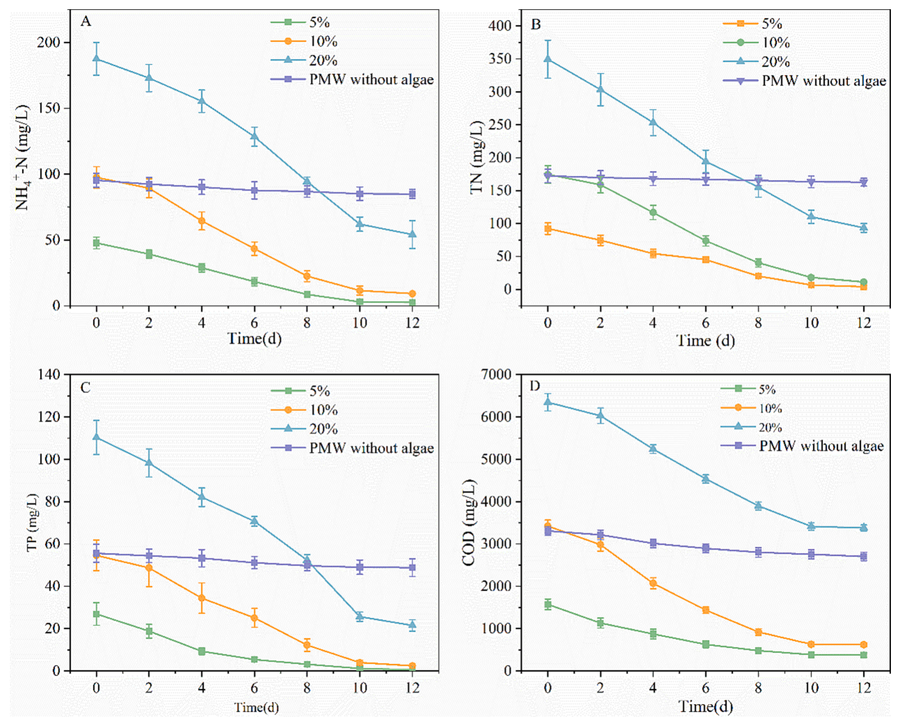 結(jié)果顯示,經(jīng)過12天的處理,原生微生物在10%的PMW中分別去除了6%、11%、12%和18%的TN、NH4+-N、總磷和COD(圖1)。這表明,雖然PMW中存在的原生細(xì)菌促進(jìn)了營養(yǎng)物質(zhì)的去除,但硅藻在處理原料PMW中發(fā)揮了主要作用。根據(jù)上述結(jié)果和PMW的排放標(biāo)準(zhǔn),確定了10%的PMW是通過C. muelleri和細(xì)菌培養(yǎng)對PMW進(jìn)行生物修復(fù)的最適宜濃度。