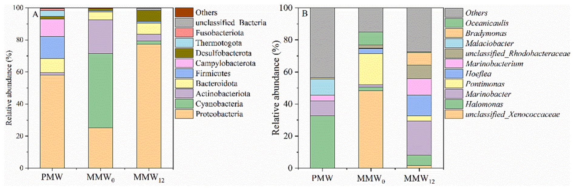 為了進(jìn)一步明確細(xì)菌在系統(tǒng)中的作用,在門和屬水平上的10個優(yōu)勢分類群如圖5A和5B所示。Proteobacteria豐度在PMW中達(dá)到58%,與C. muelleri在MMW12共培養(yǎng)條件下增加到77%。變形桿菌中含有多種促進(jìn)氮轉(zhuǎn)化和有機(jī)物降解的功能菌株。此外,與PMW相比,MMW12組放線菌和藍(lán)藻菌的豐度也有所增加。