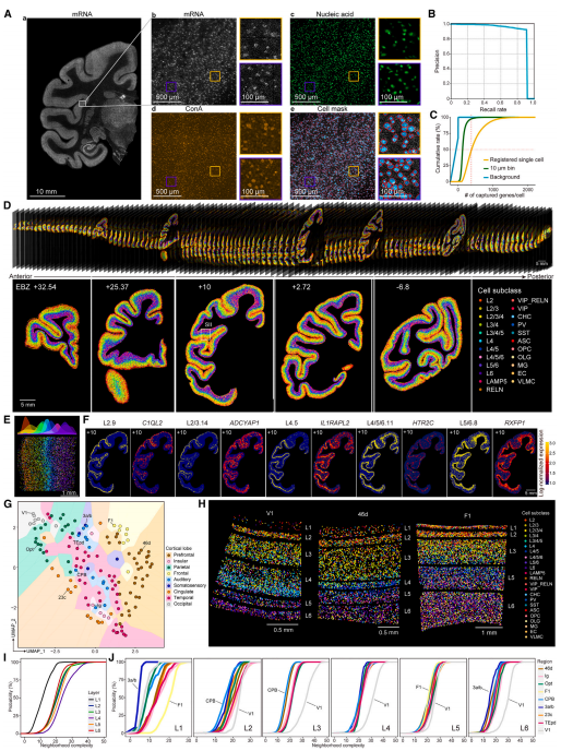 取樣策略:每隔500 μm取一次:包含兩個50 μm的大腦樣品切片進(jìn)行snRNA-seq+一張10 μm切片進(jìn)行空間轉(zhuǎn)錄組+兩張臨片切片進(jìn)行尼氏染色。獼猴#1 119張切片、獼猴#2 19張切片、獼猴#3 23張切片,共161張進(jìn)行空間轉(zhuǎn)錄組闡明大腦皮層的細(xì)胞組織是理解大腦結(jié)構(gòu)和功能的關(guān)鍵。在本研究中,研究人員利用大規(guī)模單核RNA測序和143個獼猴皮質(zhì)區(qū)域的空間轉(zhuǎn)錄組學(xué)分析,獲得了264種轉(zhuǎn)錄組定義的皮質(zhì)細(xì)胞類型的綜合圖譜,并繪制了它們在整個皮質(zhì)的空間分布。表征了谷氨酸能、氨基丁酸能和非神經(jīng)元細(xì)胞類型的皮質(zhì)層和區(qū)域偏好,以及細(xì)胞類型組成和“鄰域復(fù)雜性”的區(qū)域差異。值得注意的是,研究人員發(fā)現(xiàn)了視覺和體感系統(tǒng)中各種細(xì)胞類型的區(qū)域分布與區(qū)域等級水平之間的關(guān)系。來自人類、獼猴和小鼠皮層的轉(zhuǎn)錄組學(xué)數(shù)據(jù)的跨物種比較進(jìn)一步揭示了靈長類特異性細(xì)胞類型在第4層富集,其標(biāo)記基因以區(qū)域依賴的方式表達(dá)。該研究數(shù)據(jù)為理解靈長類動物大腦的進(jìn)化、發(fā)育、衰老和發(fā)病機(jī)制提供了細(xì)胞和分子基礎(chǔ)。