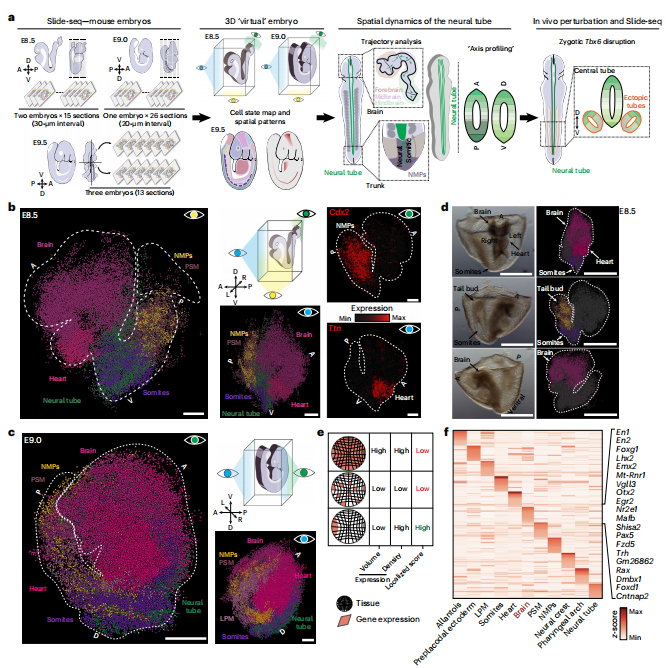 取樣策略:小鼠E8.5期胚胎:2個胚胎,15張10 μm切片,間隔30 μm;小鼠E9.0期胚胎:1個胚胎,26張10 μm切片,間隔20 μm;小鼠E9.5期胚胎:3個胚胎,13張10 μm切片在本研究中,研究人員使用Slide-seq技術(shù)構(gòu)建了完整胚胎E8.5和E9.0以及部分E9.5胚胎的空間轉(zhuǎn)錄組圖譜。為了支持該項(xiàng)研究的應(yīng)用,研究人員開發(fā)了sc3D——一個重建和探索三維“虛擬胚胎”的工具,它可以定量研究區(qū)域化的基因表達(dá)模式。發(fā)育中的神經(jīng)管主胚軸的測量揭示了幾個以前未注釋的基因具有不同的空間模式。文章還描述了Tbx6突變胚胎中出現(xiàn)的“異位”神經(jīng)管的相互沖突的轉(zhuǎn)錄特性。綜上所述,文章提出了一個用于整個胚胎結(jié)構(gòu)和突變表型時空研究的實(shí)驗(yàn)和計(jì)算框架。