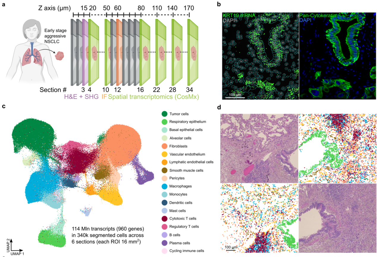 取樣策略:非小細(xì)胞肺癌(NSCLC)腫瘤塊連續(xù)切下34個5 μm切片:分別進(jìn)行二次諧波SHG成像、H&E染色、空間轉(zhuǎn)錄組(1000 Panel CosMx空間分子成像系統(tǒng))該研究展示了侵襲性人肺癌常規(guī)臨床樣本的3D空間圖譜,通過將跨340,000個細(xì)胞的960個癌癥相關(guān)基因的原位定量與組織力學(xué)成分的測量相結(jié)合,三維細(xì)胞鄰域?qū)⒛[瘤微環(huán)境細(xì)分為腫瘤、基質(zhì)和免疫多細(xì)胞生態(tài)位。有趣的是,偽時間分析表明,在基質(zhì)浸潤性腫瘤細(xì)胞中檢測到的促侵襲性上皮細(xì)胞向間充質(zhì)細(xì)胞轉(zhuǎn)化(EMT)已經(jīng)發(fā)生在腫瘤表面的一個區(qū)域。在那里,肌成纖維細(xì)胞和巨噬細(xì)胞特異性地與侵襲前腫瘤細(xì)胞共定位,它們的多細(xì)胞分子特征確定了生存時間較短的患者。與2D相比,3D鄰域通過識別樹突狀生態(tài)位,捕捉T細(xì)胞生態(tài)位的3D擴(kuò)展和促進(jìn)生態(tài)位特異性細(xì)胞-細(xì)胞相互作用的量化(包括可藥物免疫檢查點(diǎn)),改善了免疫生態(tài)位的表征。