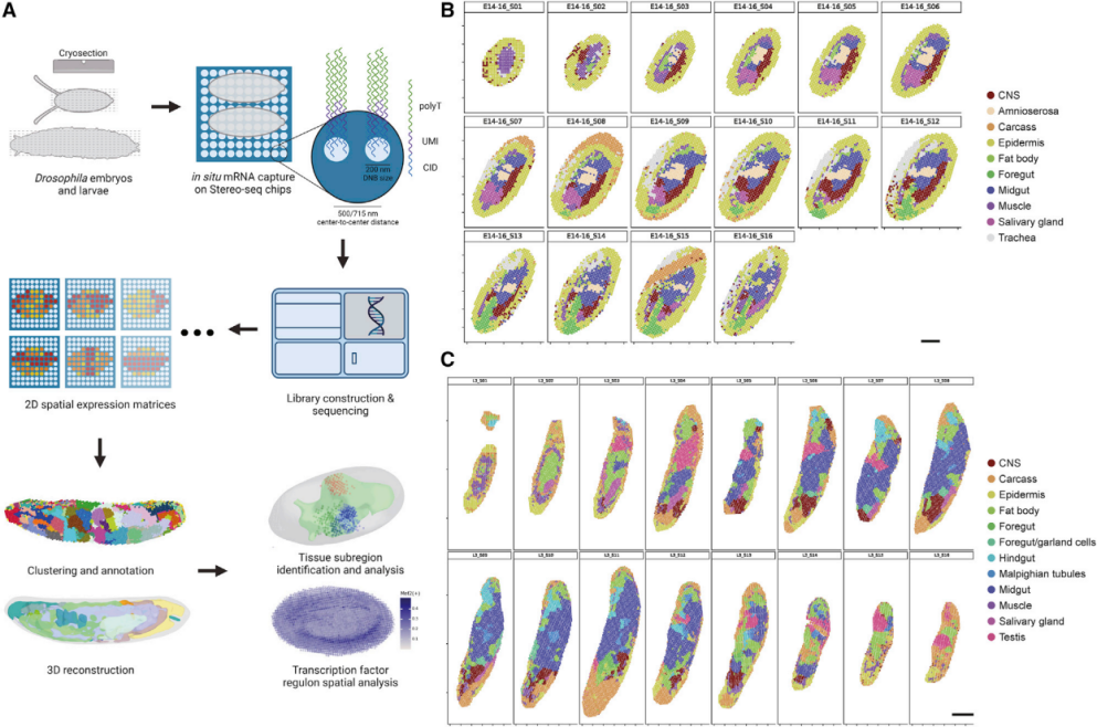 取樣策略:胚胎發(fā)生過程的24小時內(nèi),每隔0.5至2小時收集一次胚胎;3個幼蟲期的每個早/晚時間點(diǎn)采集幼蟲樣本;蛹化后每隔12 h采集一次蛹樣。共計(jì)43個胚胎、9個幼蟲、5個蛹,收集7或8 μm厚度的矢狀面進(jìn)行空間轉(zhuǎn)錄組。