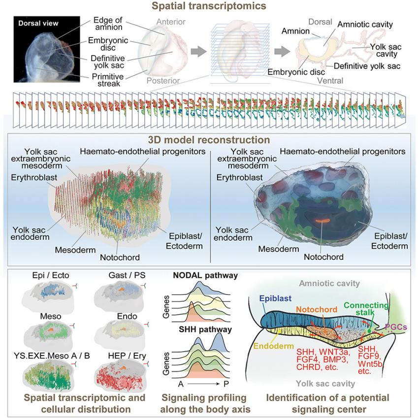 在本研究中,通過構(gòu)建完整的CS8人類胚胎3D模型,將單個細(xì)胞的空間信息與其基因表達(dá)譜相結(jié)合,系統(tǒng)描繪了胚胎形態(tài)、細(xì)胞類群、空間位置和轉(zhuǎn)錄組特征,準(zhǔn)確注釋了不同的細(xì)胞亞型,深度解析了重要胚外組織羊膜細(xì)胞發(fā)育過程和卵黃囊造血譜系特化,重點(diǎn)發(fā)現(xiàn)了參與早期發(fā)育的不同信號通路采用不同的策略沿胚胎A-P軸建立差異激活的特點(diǎn)。這項(xiàng)研究不僅可以確定人類原腸胚形成過程的關(guān)鍵細(xì)胞和分子特征,還可以指導(dǎo)今后干細(xì)胞衍生的人類胚胎模型的生成。
