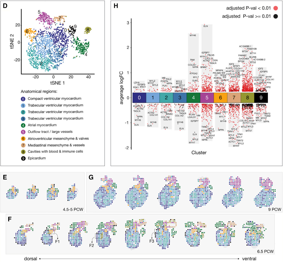 取樣策略:4.5-5 PCW 4張切片,6.5 PCW 9張切片,9 PCW 6張切片,合計(jì)19張切片文章構(gòu)建了單細(xì)胞時空水平的發(fā)育中器官的3D轉(zhuǎn)錄圖譜,這種多轉(zhuǎn)錄組測序方法可以應(yīng)用于其他器官發(fā)育的研究中。這一突破性研究使探索組織的整體空間轉(zhuǎn)錄模式成為可能,探索細(xì)胞異質(zhì)性,并選擇性地靶向一些表達(dá)模式具有空間異質(zhì)性且造成細(xì)胞類型差異的關(guān)鍵基因。心臟發(fā)育模型表明,空間、時間信息與單細(xì)胞基因表達(dá)數(shù)據(jù)的整合對于識別細(xì)胞類型之間的關(guān)鍵差異、深入分析發(fā)育中的組織是至關(guān)重要的。