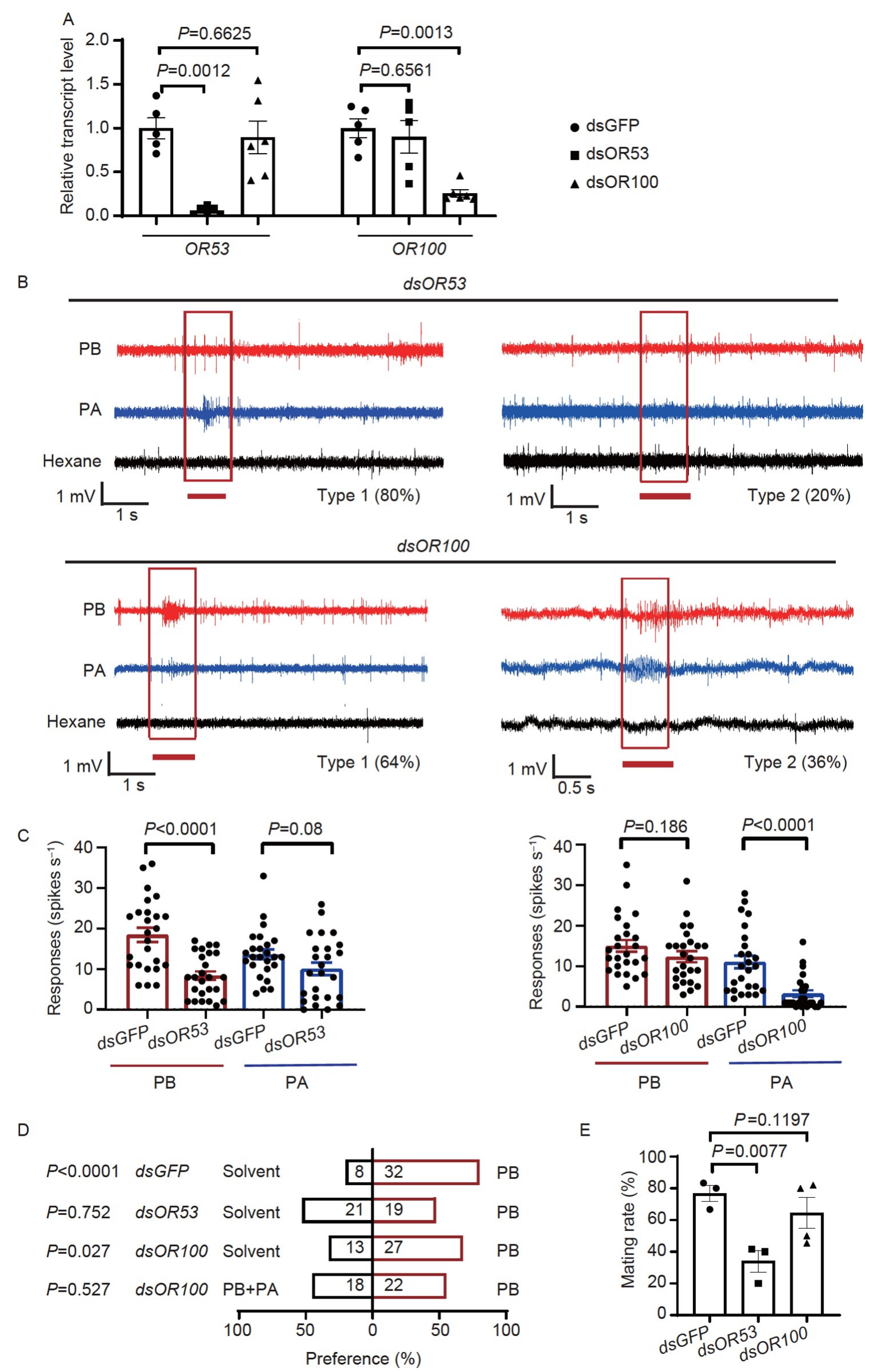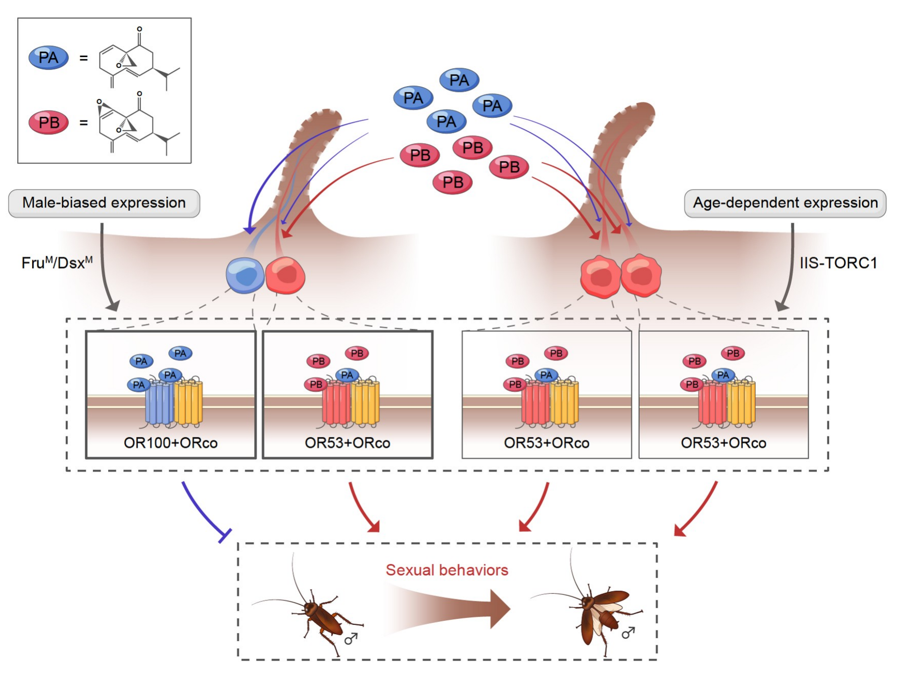 研究結(jié)果表明,PB作為主要的性信息素成分,通過(guò)激活OR53受體來(lái)誘導(dǎo)雄蟲(chóng)的求偶交配行為。而PA雖然單獨(dú)存在時(shí)不吸引雄蟲(chóng),但其存在能夠通過(guò)兩種可能的途徑減弱PB的吸引作用:一是PA與PB競(jìng)爭(zhēng)激活相同的受體OR53,二是PA通過(guò)激活其特定的受體OR100來(lái)抑制性行為。該研究確定了兩種性信息素嗅覺(jué)受體以及可能調(diào)控雄蟲(chóng)特異性和年齡依賴(lài)性求偶交配行為的分子機(jī)制,有助于發(fā)展綠色防蟑技術(shù)及害蟲(chóng)綜合管理策略。