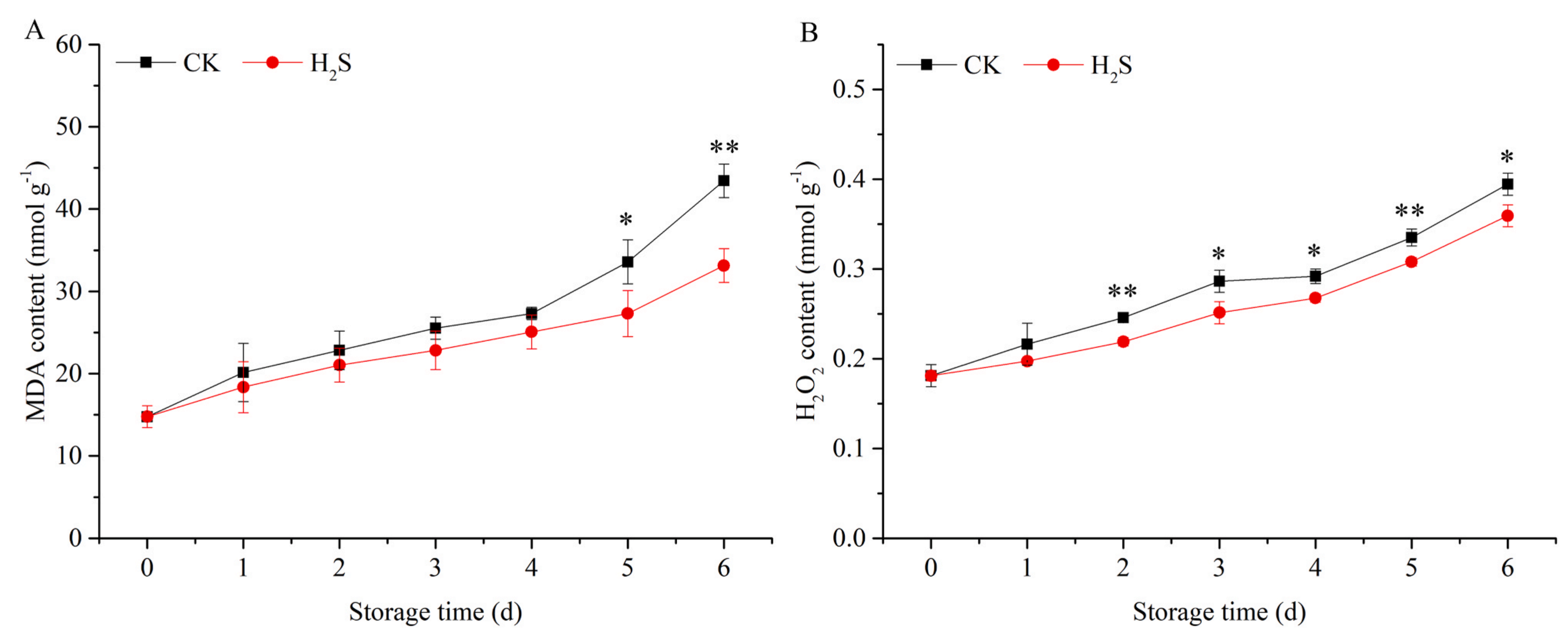 對比3.2 mM NaHS處理和未處理的黃花菜MDA含量,結(jié)果顯示,貯藏6 d內(nèi),CK和H2S處理組MDA含量均持續(xù)升高。貯藏4 d后,H2S處理顯著抑制了MDA含量的增加。H2S處理的黃花菜在貯藏過程中H2O2的產(chǎn)生被阻斷。