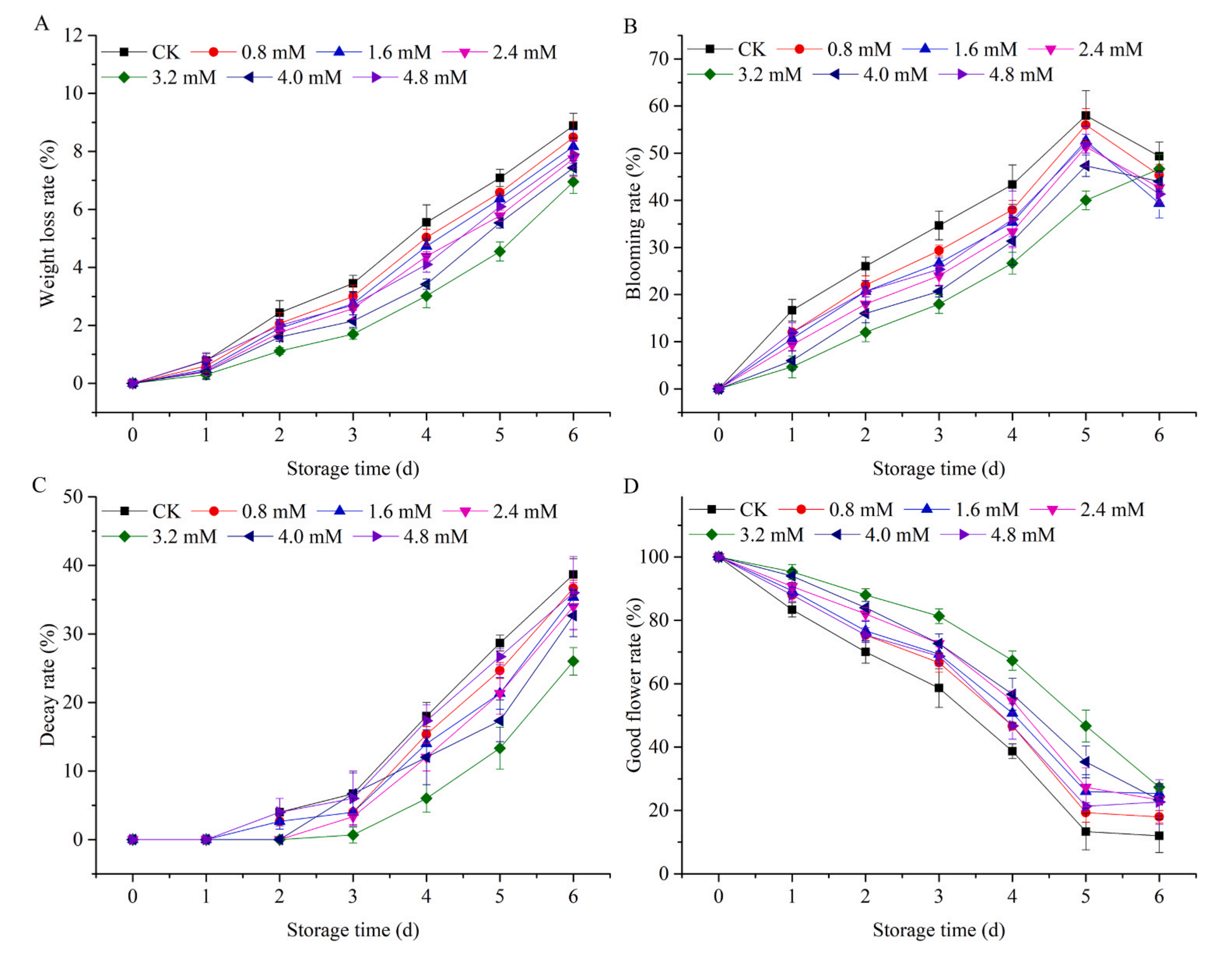 本研究選用黃花菜(萱草)“大同黃花”,產(chǎn)于中國山西省大同市云州區(qū)?;ɡ偈窃谏虡I(yè)成熟前采摘的。將剛采收的黃花菜花蕾在4℃預(yù)冷后,在4 h內(nèi)立即運至實驗室?;ɡ兕伾?、形狀、大小均勻,無物理損傷,分為7組。將每組黃花菜芽(200 g)分別置于含有200 mL蒸餾水、0.8、1.6、2.4、3.2、4.0、4.8 mM NaHS溶液(H2S供體)的干燥器中。干燥劑保存于4℃,相對濕度85% ~ 95%。測定了黃花菜的失重率、開花率、腐爛率和良花率,初步評價了黃花菜的品質(zhì)。