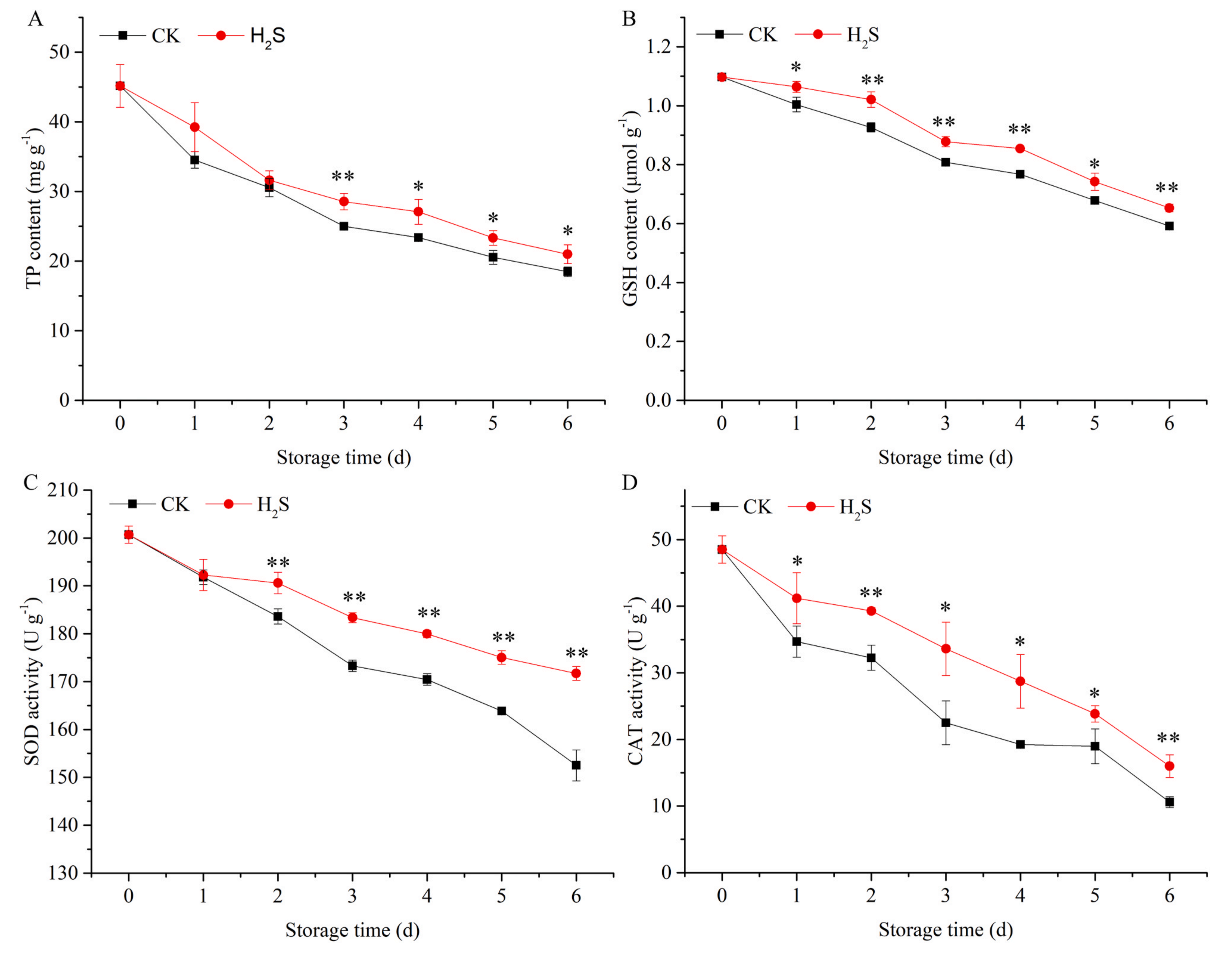 在CK和H2S處理組中,TP含量均隨貯藏時間的延長而下降。H2S處理減緩了TP含量的下降,且從第3 d開始出現(xiàn)顯著差異,說明H2S起到了阻斷蛋白的作用。H2S還改變了黃花菜的抗氧化系統(tǒng)。在整個貯藏期內(nèi),H2S處理組采后黃花菜GSH含量顯著高于CK組。黃花菜SOD活性呈下降趨勢,而H2S在第2 d開始顯著緩解了這種下降趨勢,維持在高于CK組的水平。CAT活動結(jié)果表明,H2S處理組CAT活性活性顯著高于對照。